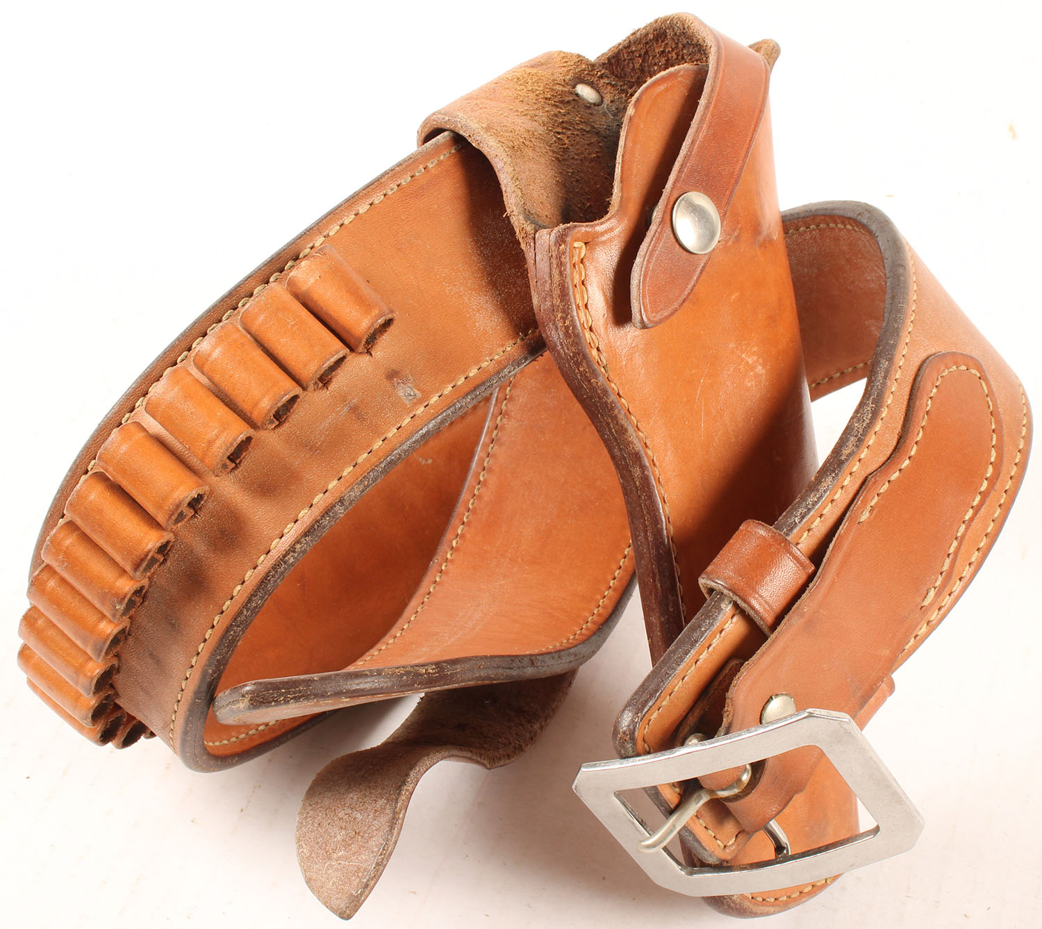 Leather ammo belt and holster, has age soiling. Grade: Very good ++ - Value: 16 to 60