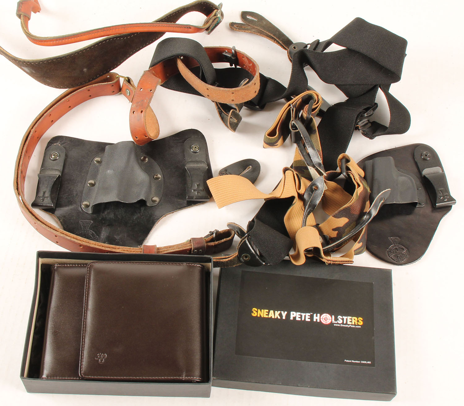 Large lot of Leather pistol holster and rifle straps, has age soiling. Grade: Very good ++ - Value: 20 to 80