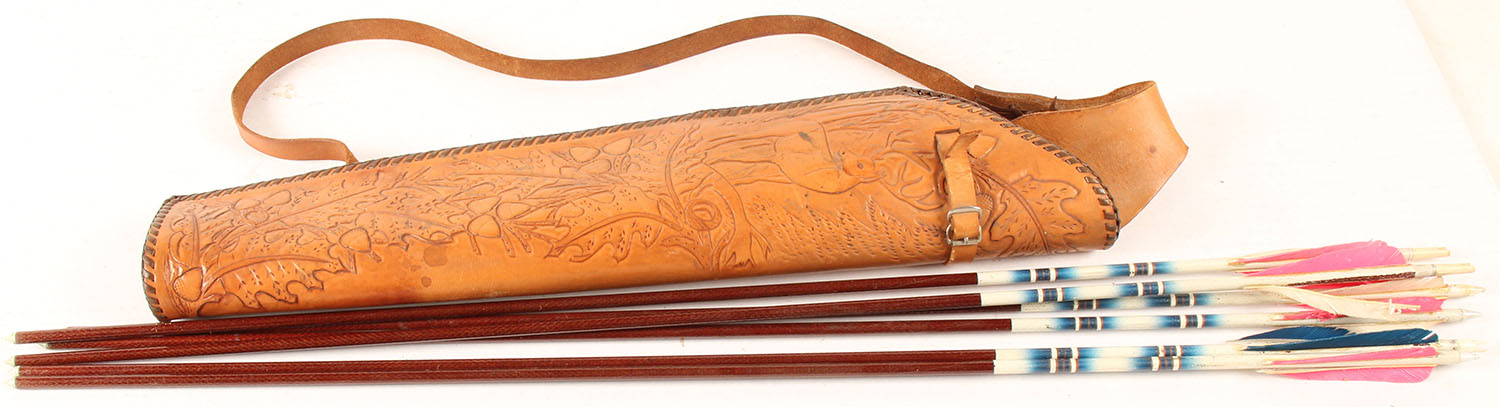 Lot of modern arrows in leather quiver, quiver has detailed tooling to leather. Grade: Excellent - Value: 50 to 200