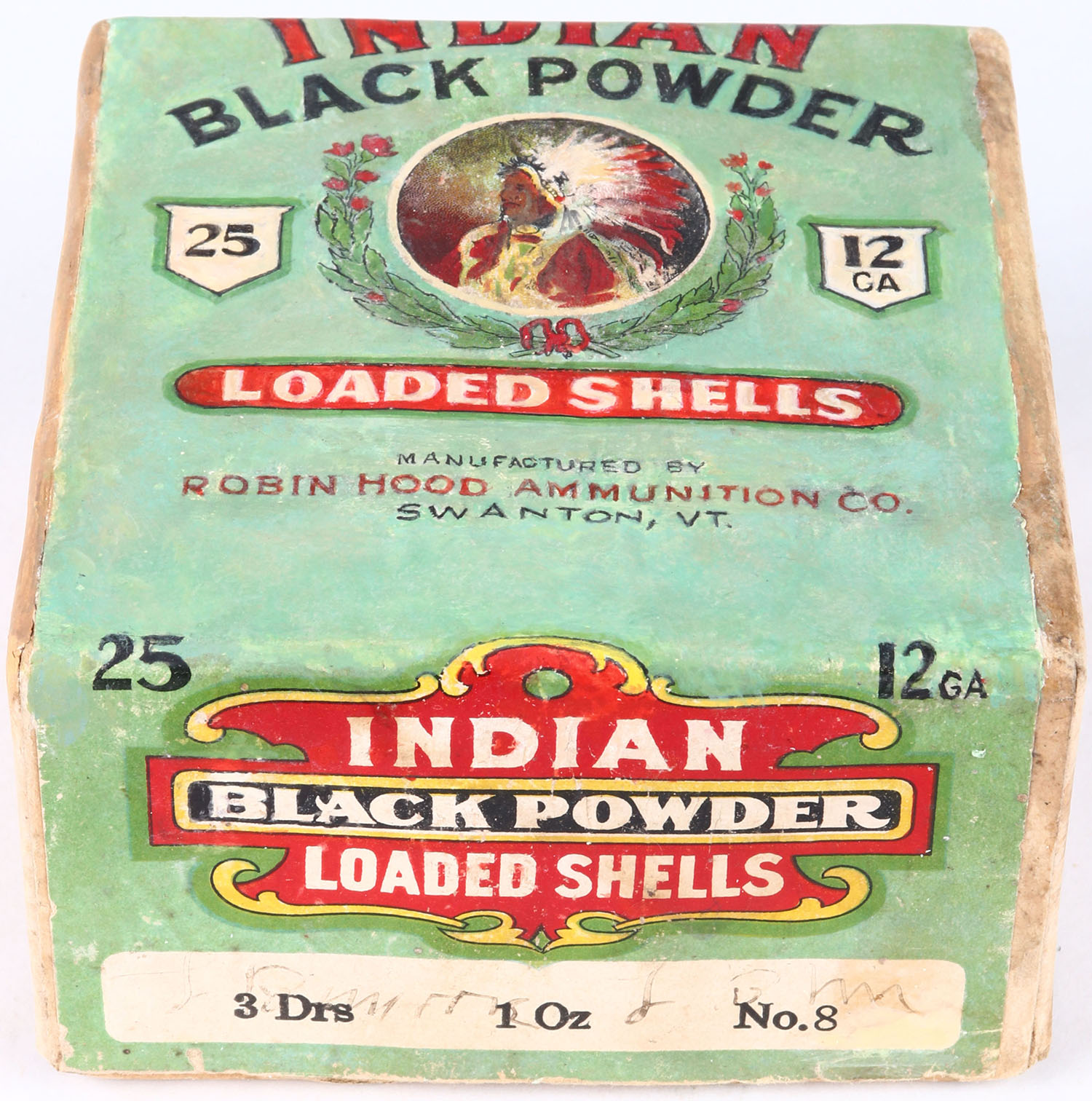 Robin Hood Ammunition Co., INDIAN BLACK POWDER, 12ga., 2pc., Empty, shot size 8, buff box with green, red, white & black label that pictures a multi colored Chief in full head dress, Loading: 3 Drs. 1 Oz. No. 8, box and label have been professionally touched up, box and label are clean & vibrant! VERY RARE BOX! Grade: Excellent + - Value: 2500 to 8000