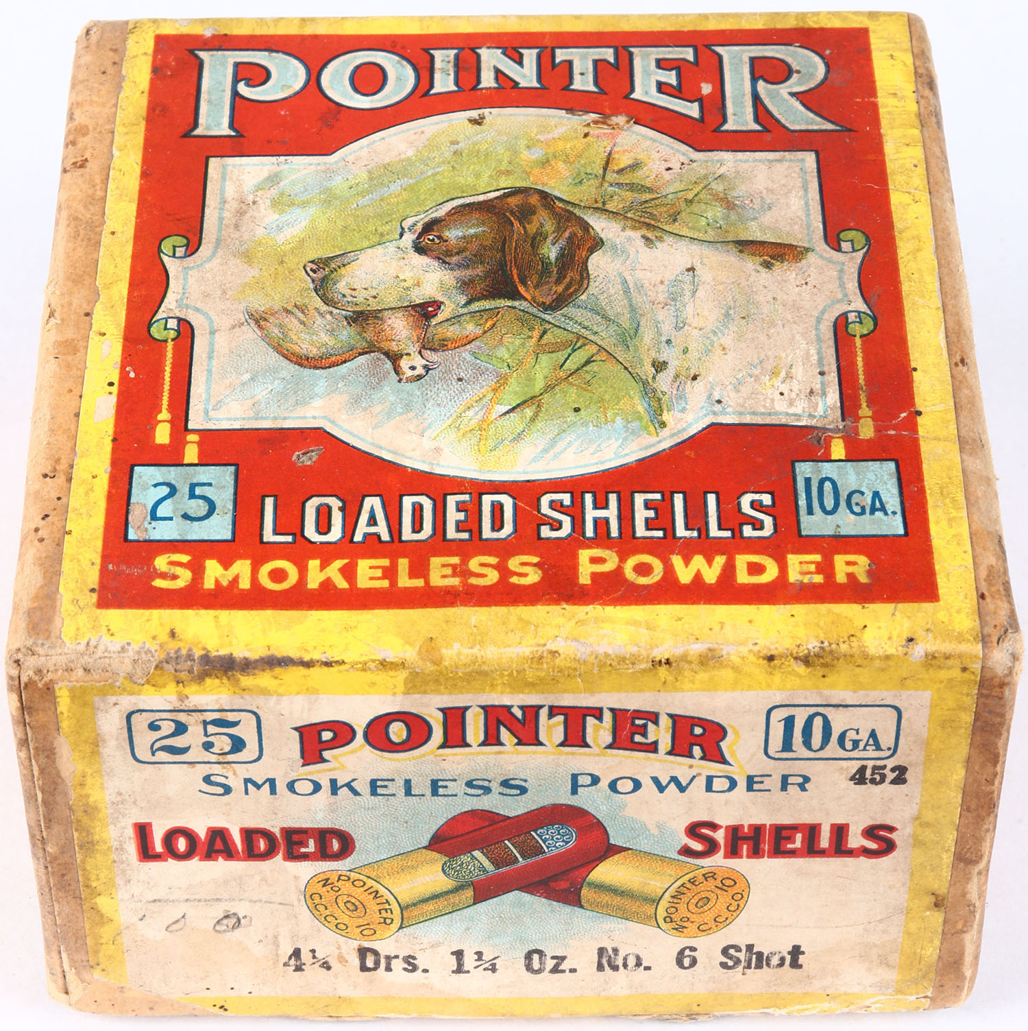 CLINTON Cartridge Co., POINTER, 10ga., 2pc., Partial 24rds with 15 being correct, shot size 6, buff box with multi-colored label of a dog holding a quail, box has nice color with age soiling, sides picture crossed shells & a dog on point, Shells are very good with shell protrusions. Grade: Excellent + - Value: 300 to 800