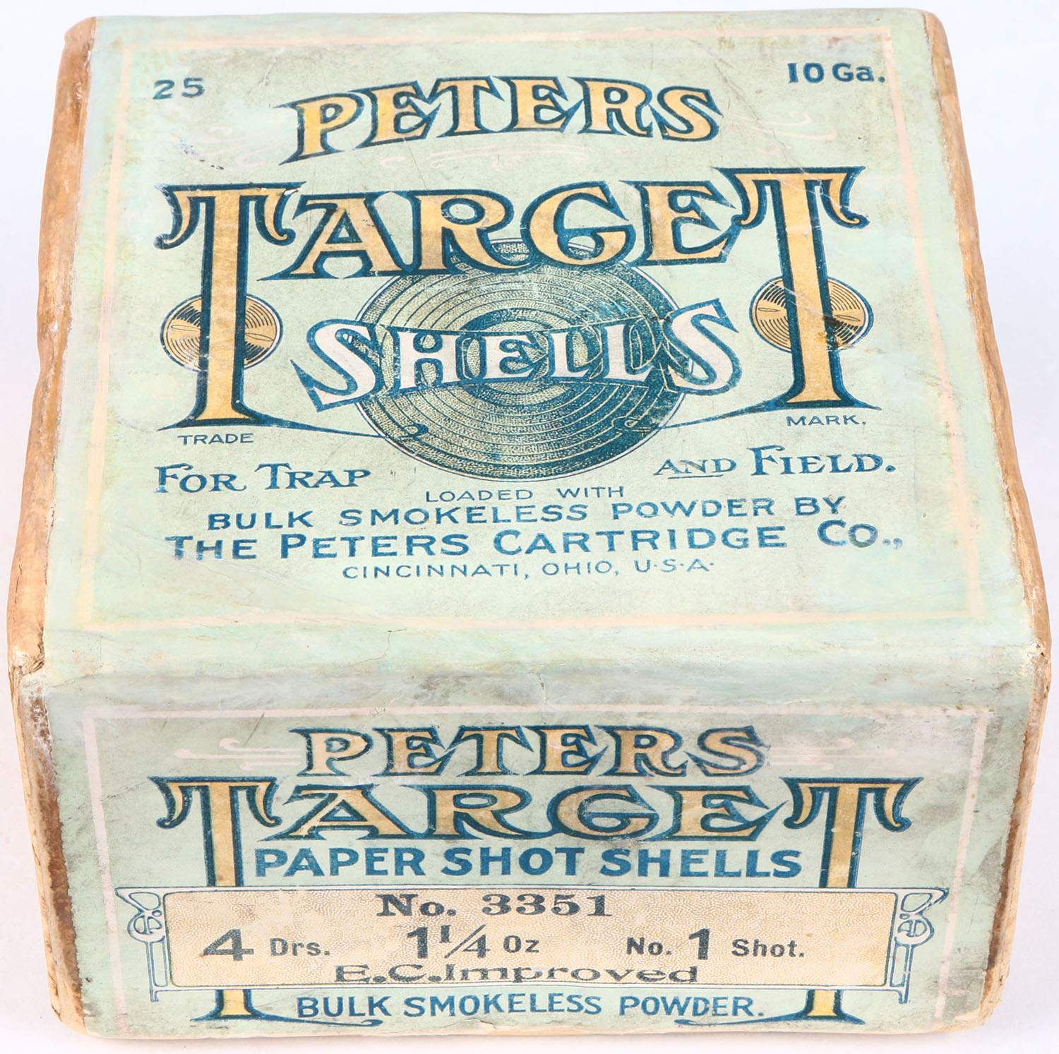 RARE!!! Peters Cart. Co. TARGET SHELLS, For Trap And Field, 10 Ga.! 2pc., Empty, shot size 1, buff box with multi colored label that pictures clay bird, box & label are solid, correct bottom, label is 100% intact and 100% original.* Grade: Excellent + - Value: 400 to 1200