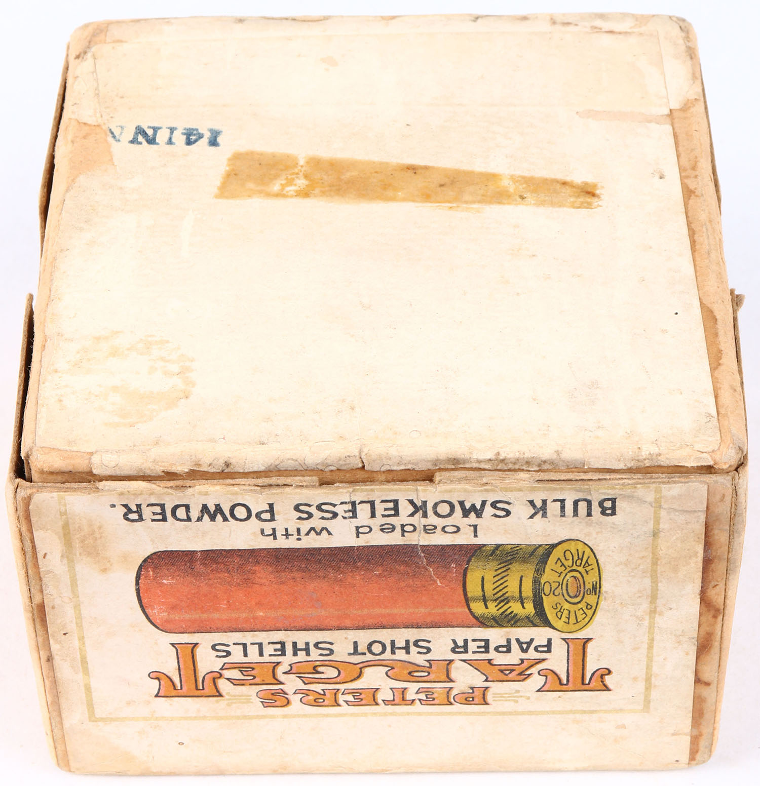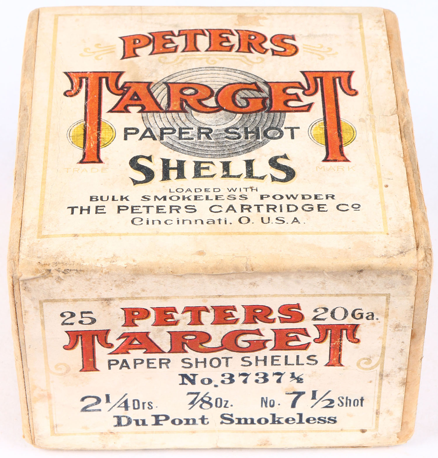 Peters Cart. Co. TARGET, 20Ga,, 2pc., Empty, shot size 7 1/2, Dupont Smokeless, buff box with multi colored label that pictures clay bird, box is very solid with great label, has light soiling. HARD TO FIND BOX!* Grade: Excellent - Value: 300 to 1000