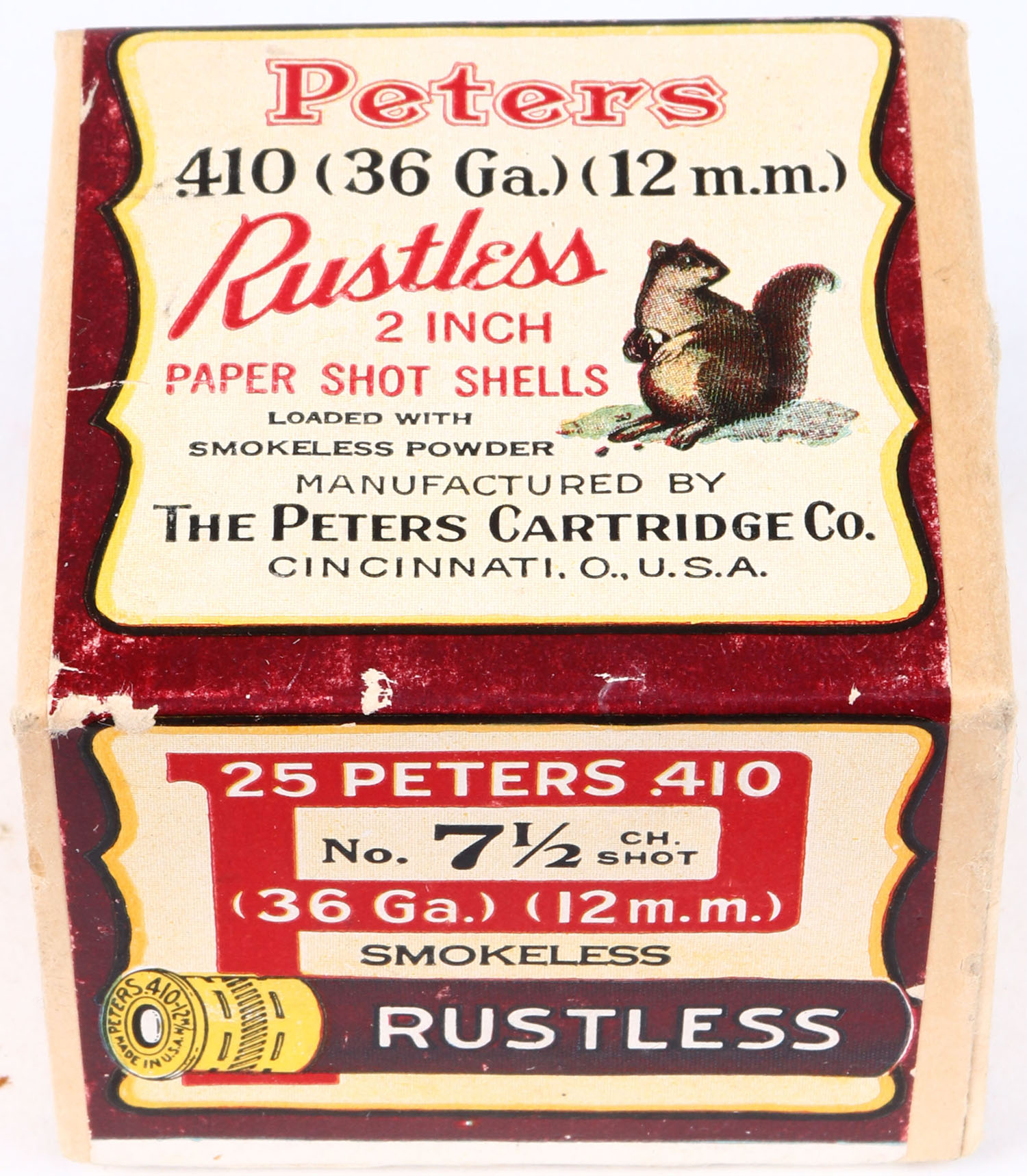 Peters Cart. Co., Paper Shot Shells, 2''. SQUIRREL BOX!!!, 410 (36Ga.) (12m.m.). GAUGE!!!, 2pc., FULL & SEALED, shot size 7 1/2CH Shot, buff box with a beautiful multi-colored label with Squirrel on front, label is excellent, Cincinnati, O. USA., VERY RARE.* Grade: Excellent ++ - Value: 1000 to 4000