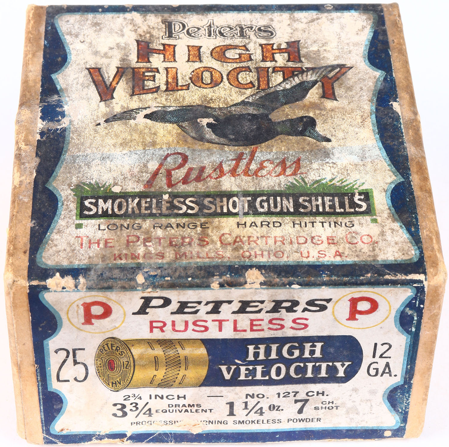 Peters Cart. Co., Blue Bill, 12ga., 2pc., Empty, shot size 7CH shot, buff box with multi colored label that pictures Blue Bill in flight, box is solid with age soiling, label is 85% intact, has nice colors. Grade: Very Good + - Value: 50 to 200