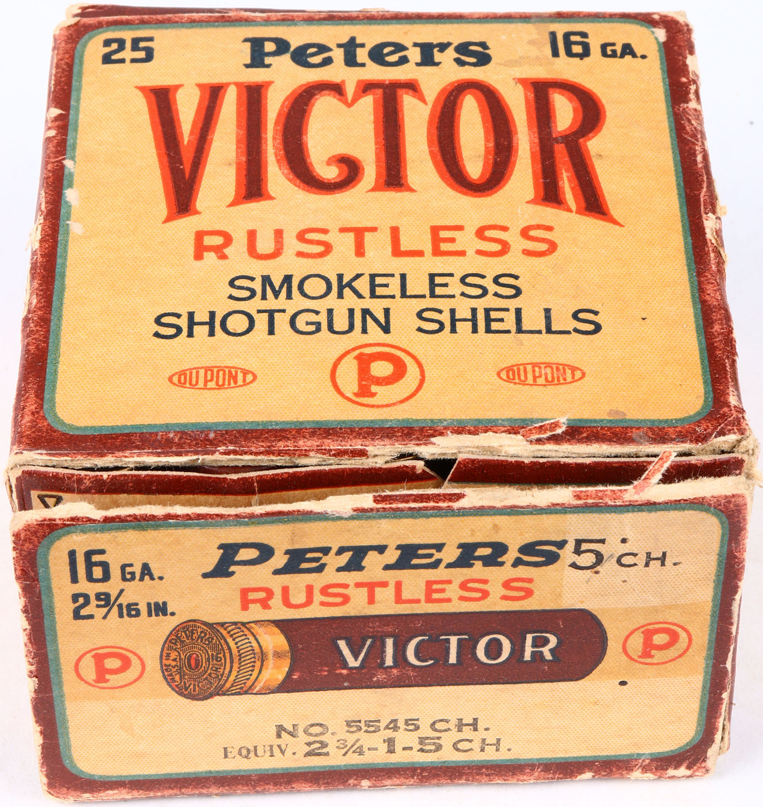 Peters, Victor, 16ga, 1pc., Full, shot size 5 CH, Maroon, cream & orange box, 2 9/16'', box has light edge wear, very nice colors, inside flap has a piece disconnected & top flap is disconnected, Shells are excellent. Grade: Very Good ++ - Value: 20 to 50