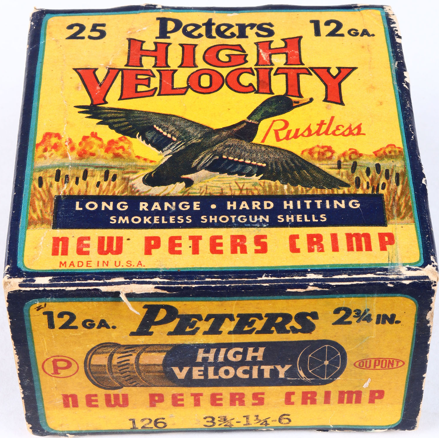 Peters Cart. Co., High Velocity, New Peters Crimp, 12ga., 1pc., Partial 19rds, shot size 6, multi colored box that pictures mallard flying out of the marsh grass, paper shells, box has light edge wear with light age soiling and nice colors, shells are very good. Grade: Very Good ++ - Value: 20 to 50