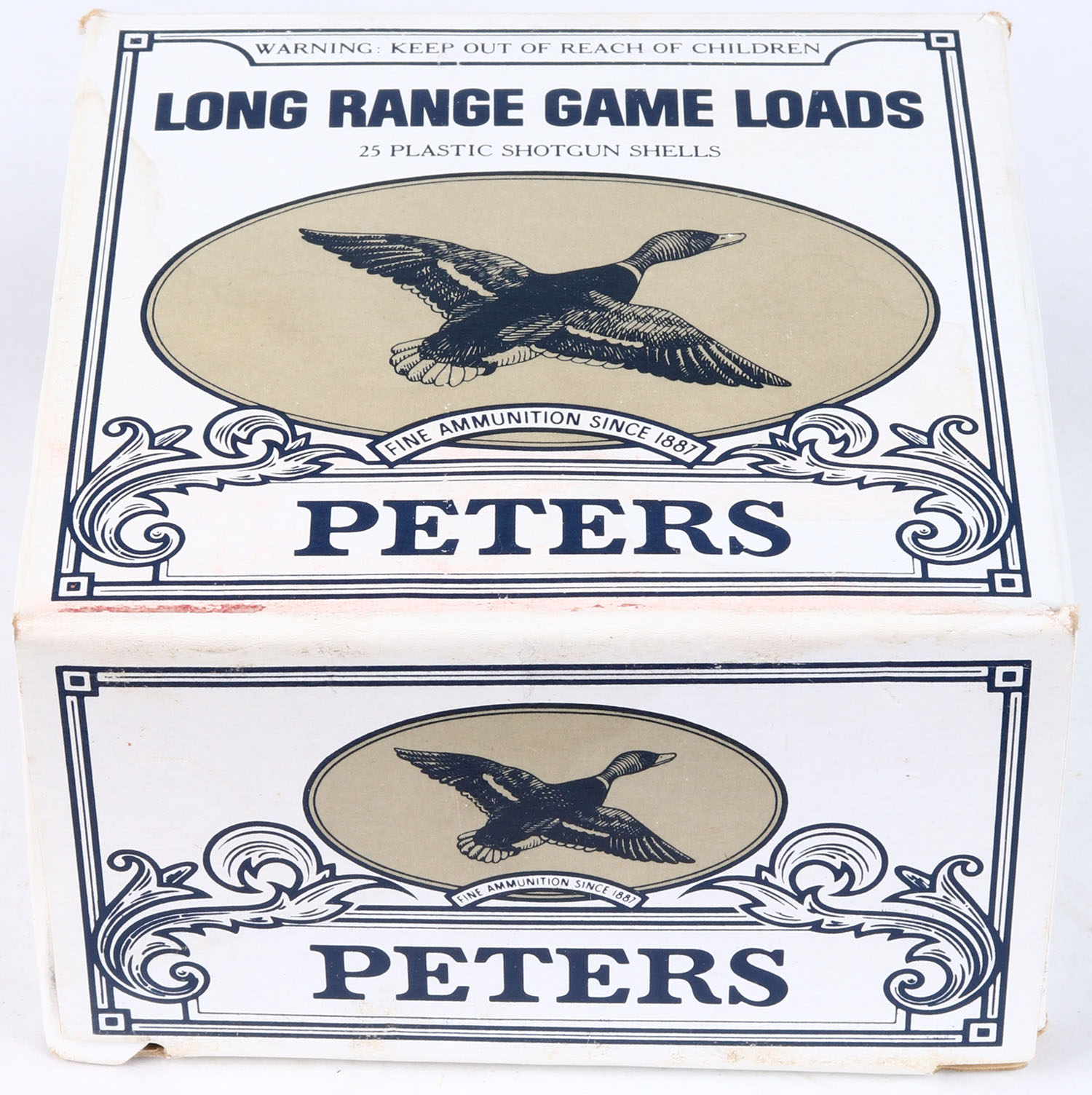 Peters, LONG RANGE GAME LOADS, 12ga., 1pc., Partial 24rds, shot size 6, solid box with excellent colors, shells are excellent. Grade: Excellent ++ - Value: 8 to 30