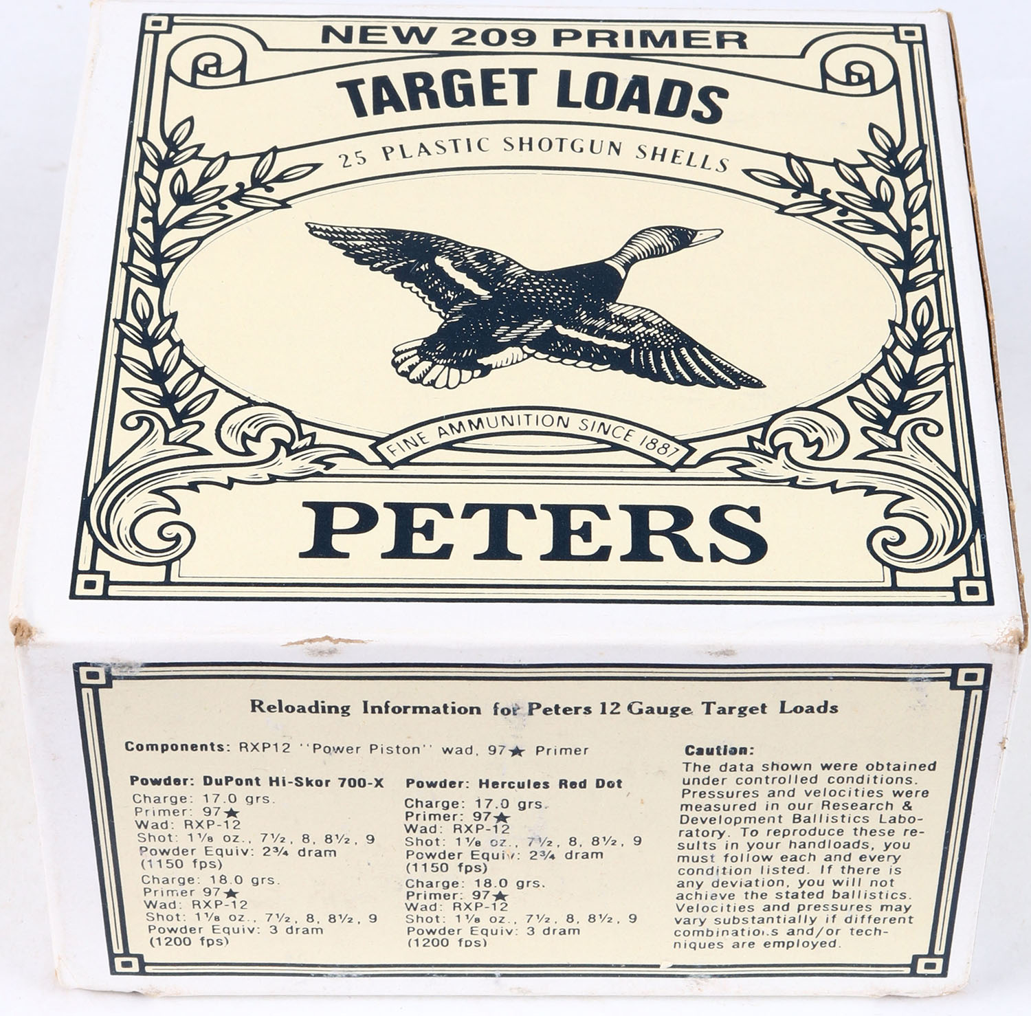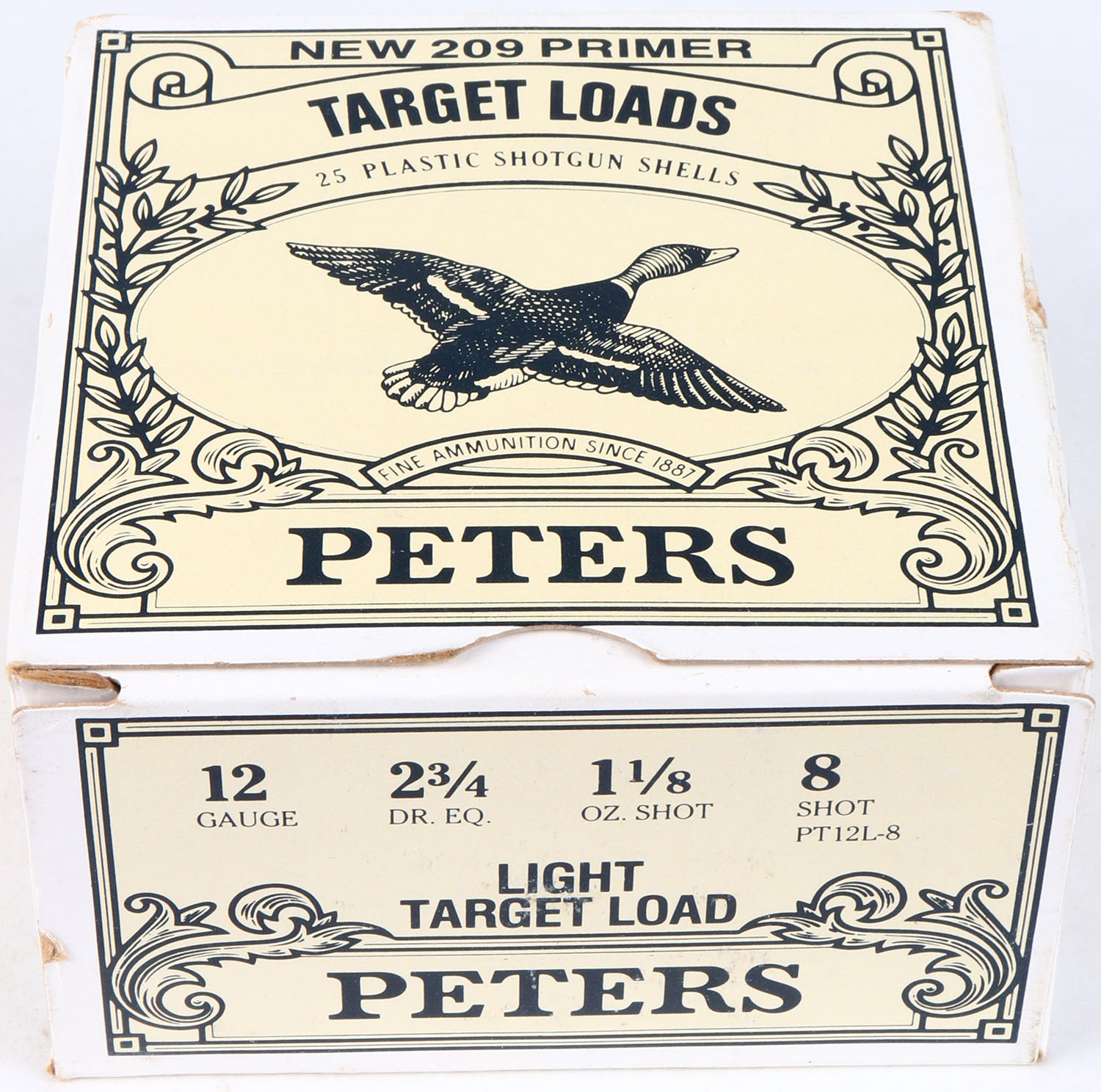 Peters, LIGHT TARGET LOAD, 12ga, 2 3/4'', 1pc., Full, shot size 8, box is very solid with great color, Shells are excellent. Grade: Excellent ++ - Value: 10 to 30