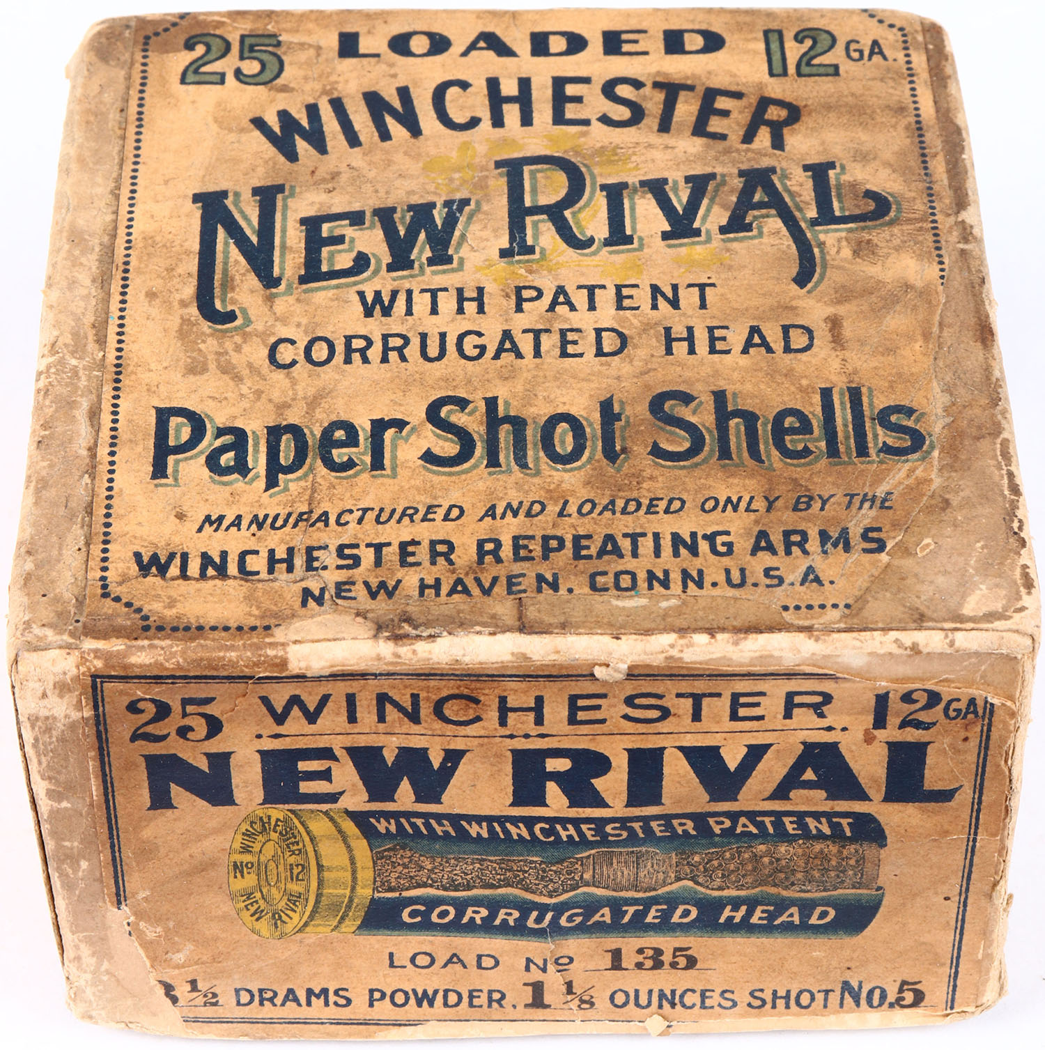 Winchester, New Rival, Corrugated Head, 12 Gauge, 2pc., Empty., Shot Size 5, Buff box with buff & blue label, box has glue & tape repair, age soiling with very nice label.* Grade: Excellent - Value: 300 to 800