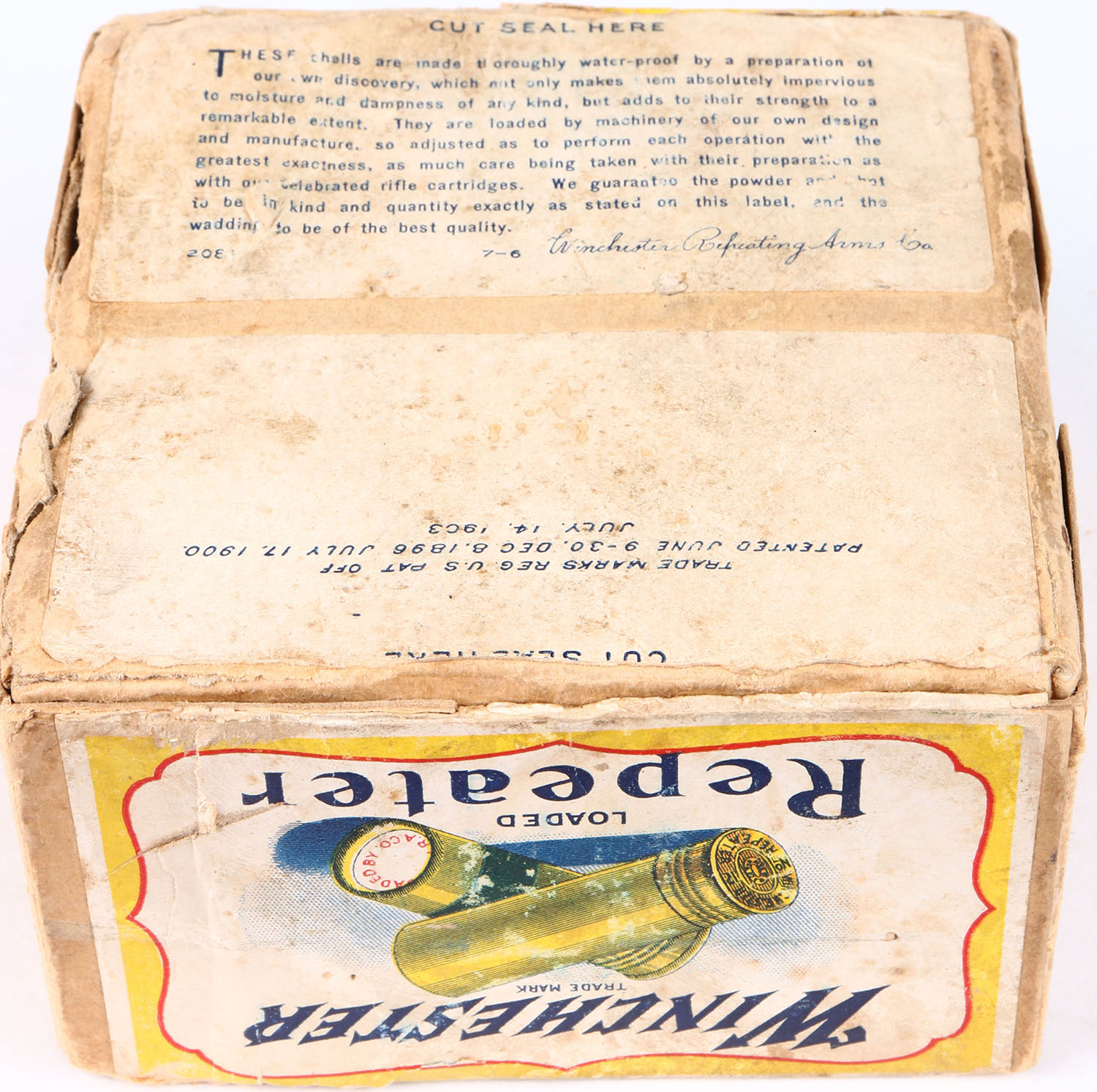 Winchester, REPEATER, 12 Gauge, 2pc., Partial 1rd, Shot Size 2, Buff box with yellow, white & red label showing lightning bolt, box has age soiling, seam splits with nice colors. Shells are very good. Grade: Very Good ++ - Value: 50 to 200