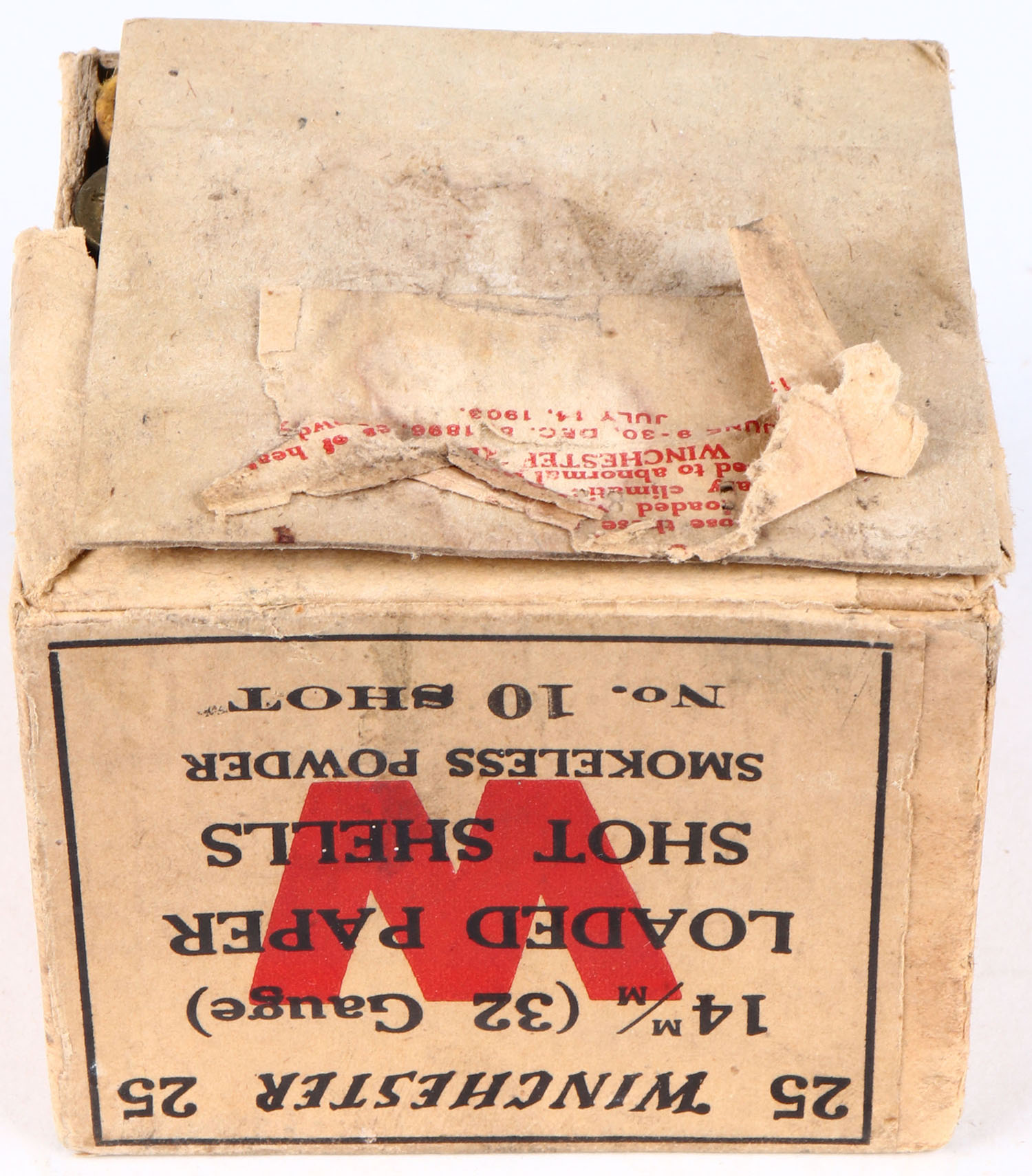 RARE Winchester, 32 GAUGE! 14m/m (32 Gauge), 2pc., FULL, PAPER SHOT SHELLS, shot size 10, buff box with buff, red & black label, bottom of box is disconnected, box has light edge wear, VERY RARE & HARD TO FIND IN 32 GAUGE. Shells are good. Grade: Excellent - Value: 150 to 600