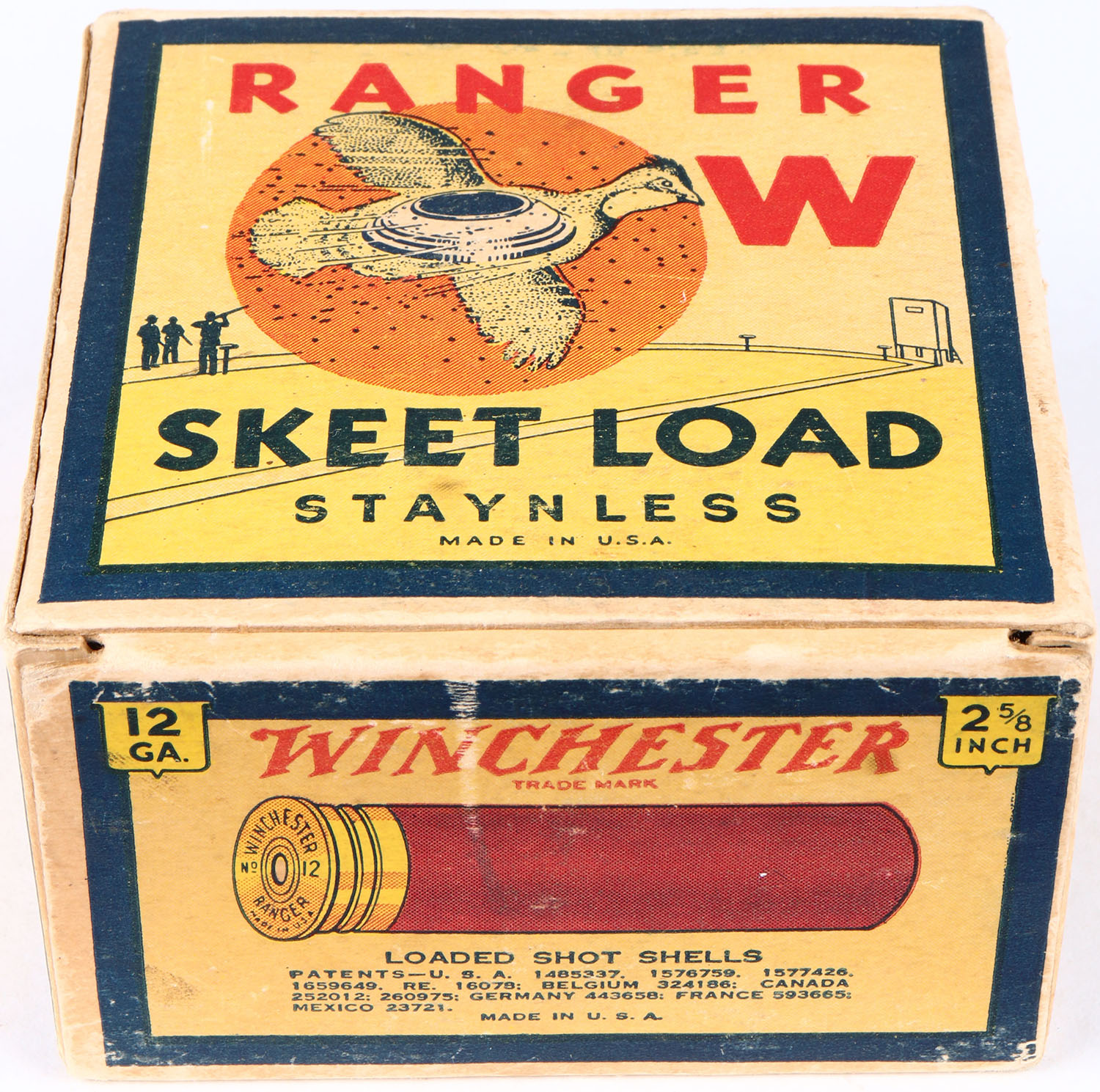 Winchester, RANGER SKEET LOAD, Hercules Red Dot, 12ga, 1pc., Partial 20rds with all being incorrect shot size, White, blue & red box that pictures flying Quail with skeet in body & shot all around, Staynless, 2 5/8'', Loading: 3 Drams 1 1/8 Oz. 9 Chilled Shot, Box is very solid with great colors, Shells are excellent. RARE BOX.* Grade: Excellent ++ - Value: 100 to 400