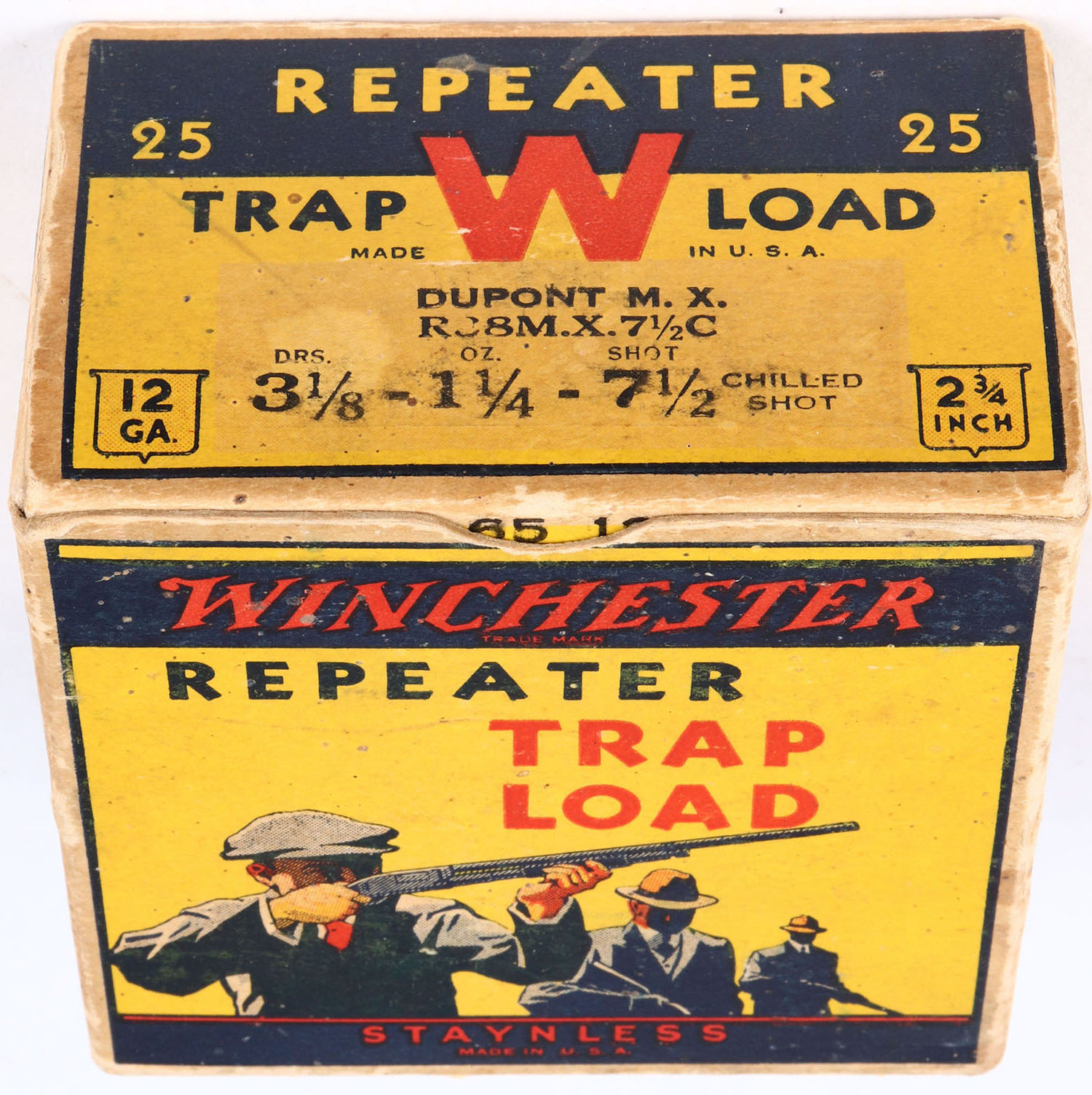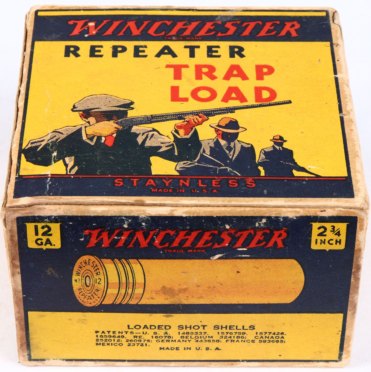 RARE Winchester, Repeater, TRAP LOAD, 12ga., 1pc., Empty, shot size 7 1/2 Chilled Shot, yellow, blue & red box that pictures trap shooters, Box is very solid, light soiling, light edge wear, & very nice colors, ONLY ONE OR TWO KNOWN! Grade: Excellent - Value: 1000 to 8000