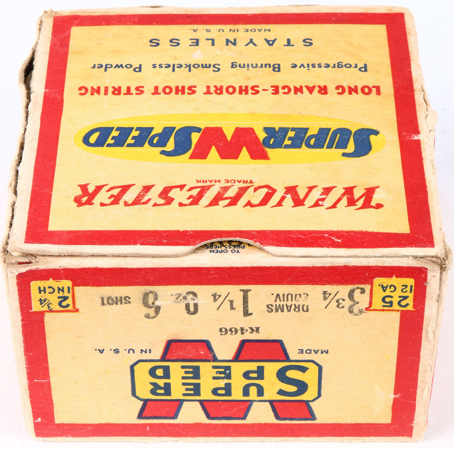 Winchester, Super W Speed, 12ga., Staynless, 2 3/4 in., 1pc., Full, shot size 6, cream, red, blue and yellow box, box with very nice colors, has seam split with shell protrusions, shells are excellent. Grade: Excellent - Value: 16 to 30