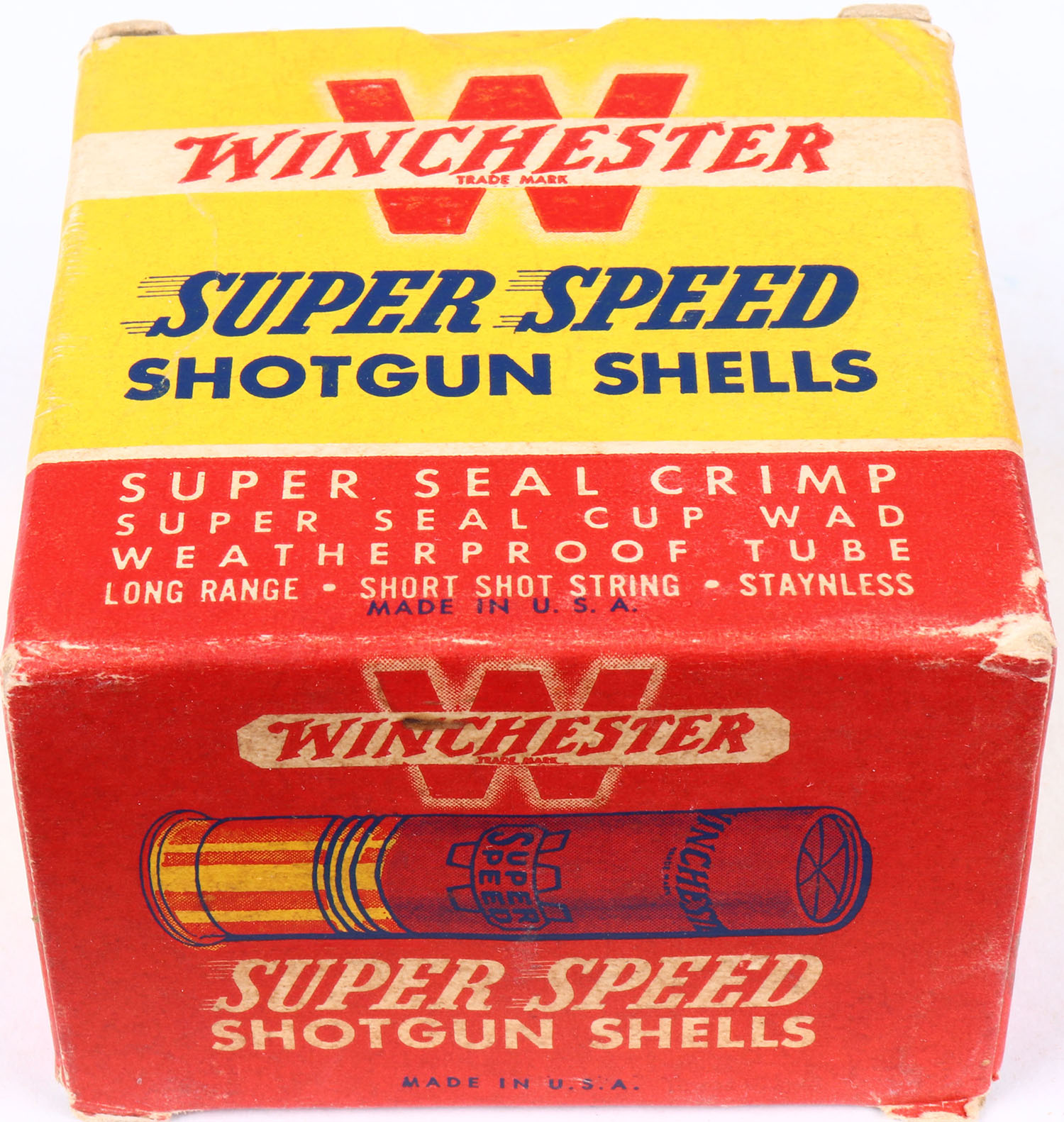Winchester, Super Speed, 20ga., 1pc., Full, 2 3/4''., shot size 7 1/2, red, yellow & blue box, box is very solid with very nice colors & light age soiling, shells are excellent. Grade: Excellent + - Value: 10 to 40
