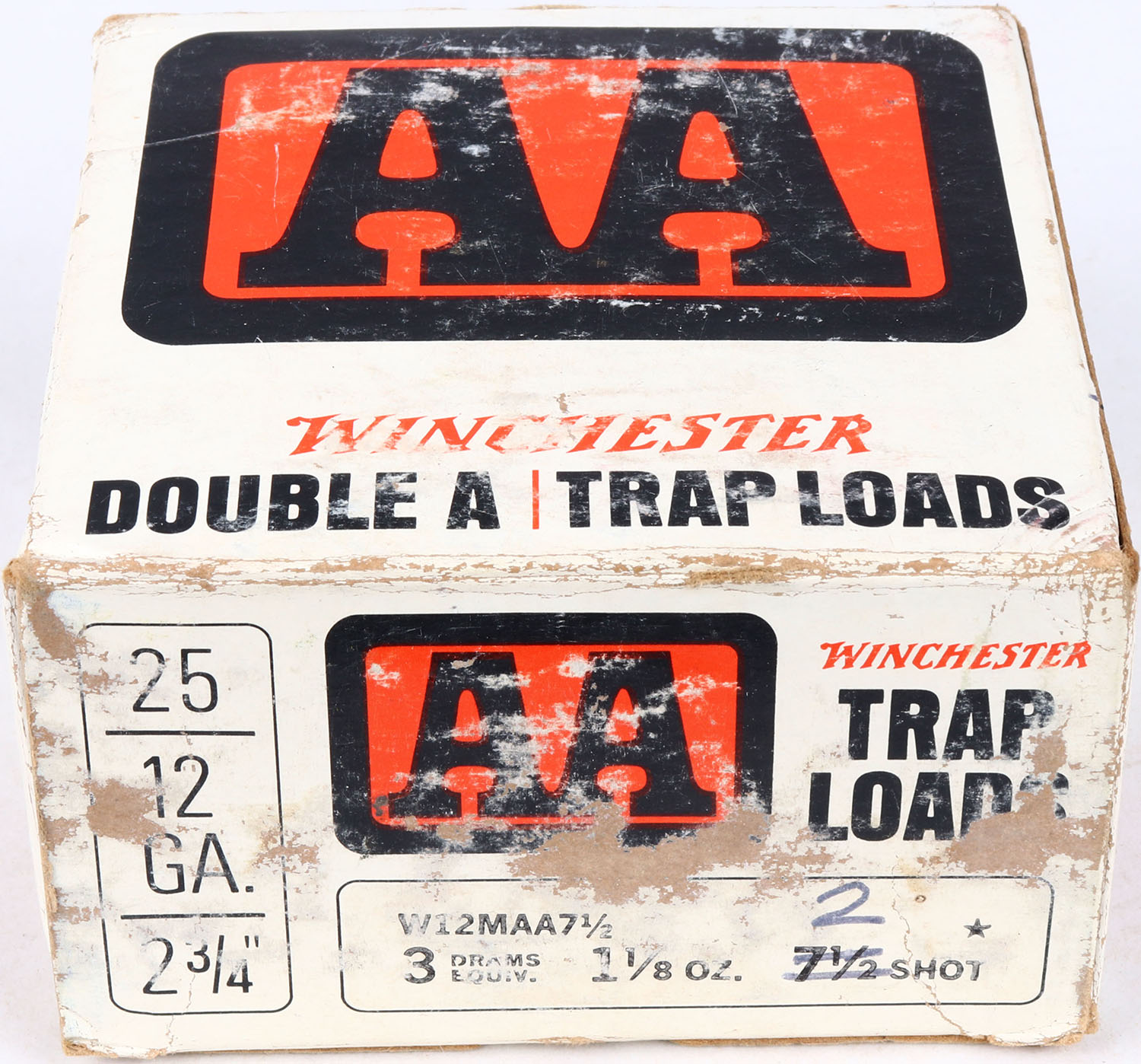 Winchester, AA Trap Load, 12 ga., shot size 7 1/2 but crossed out and replaced with 2, red, black, & white box, solid box, ammo is very good. Grade: Very Good ++ - Value: 10 to 40