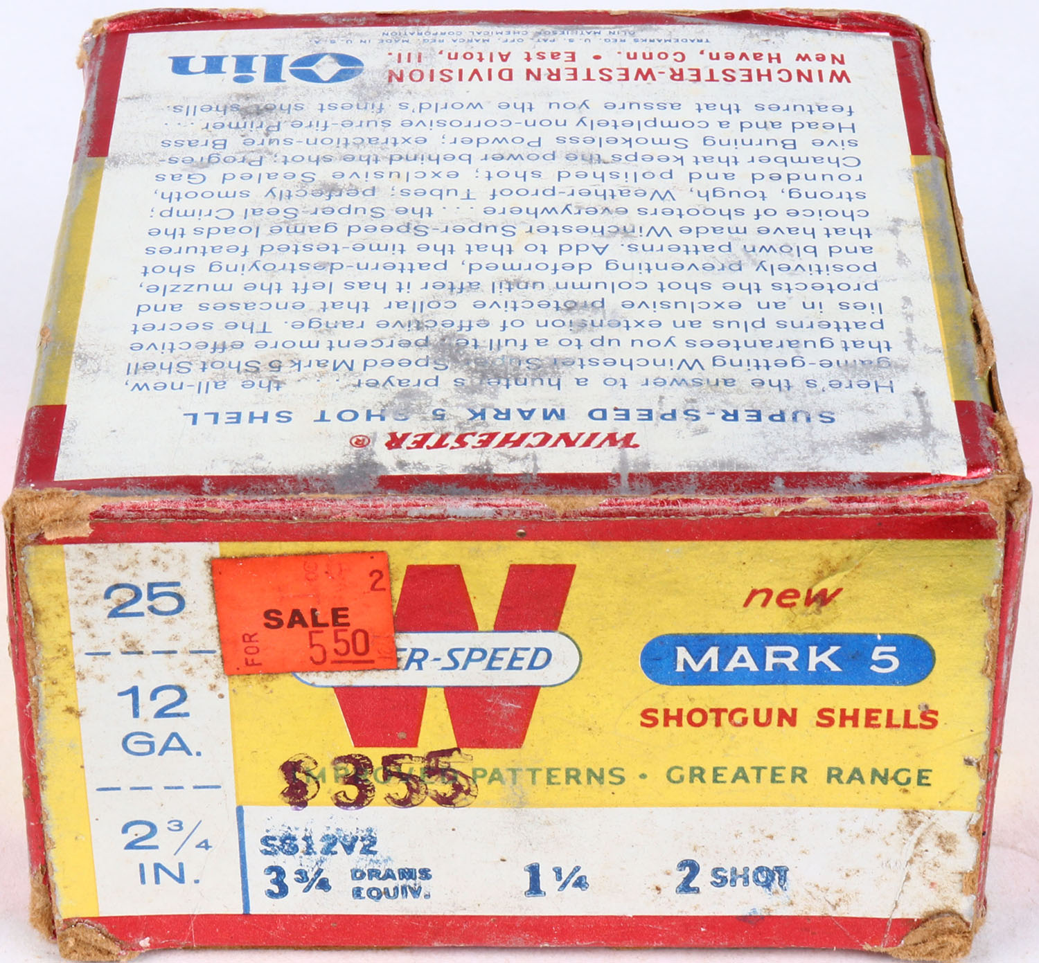 Western, Super-X Mark 5, 12ga., 2 3/4'', 1pc., Full with 6 being correct, shot size 2, multi-colored box, box is solid, shells are very good. Grade: Very Good ++ - Value: 10 to 30