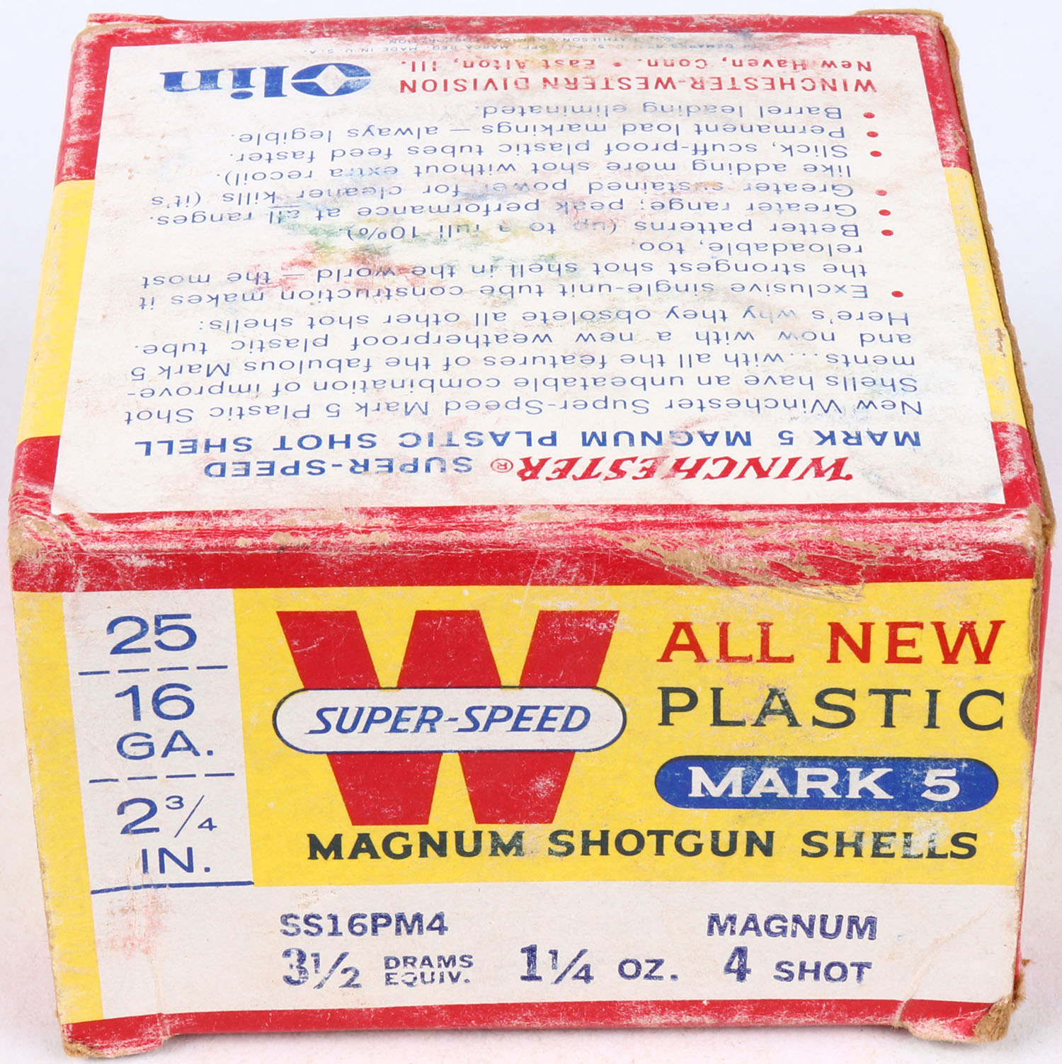 Winchester, Super Speed Mark 5, 16 ga., 2 3/4'', 1pc., Full, shot size 4 Magnum, yellow, blue & red box, box is solid with light soiling, shells are excellent. Grade: Excellent + - Value: 10 to 30
