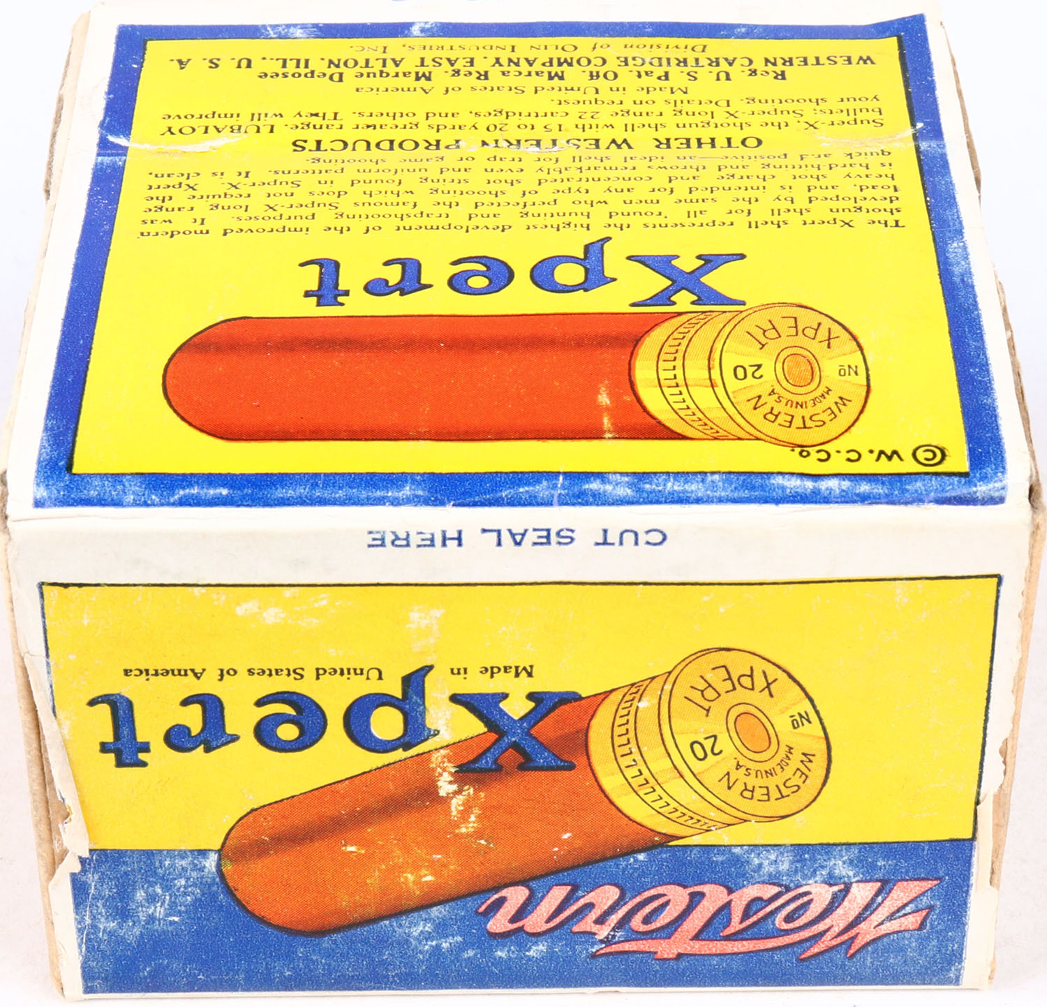 Western, Xpert, 20ga., 2pc., FULL and SEALED, shot size ?, buff box with blue and yellow paper label that pictures the pointer dog on top, box is very solid has light age soiling with great colors. Front of box says ''Shot and Powder Not Loaded In U.S.A'' but says ''Made In United States Of America'' on top of box, loaded in Mexico. Grade: Excellent - Value: 50 to 200