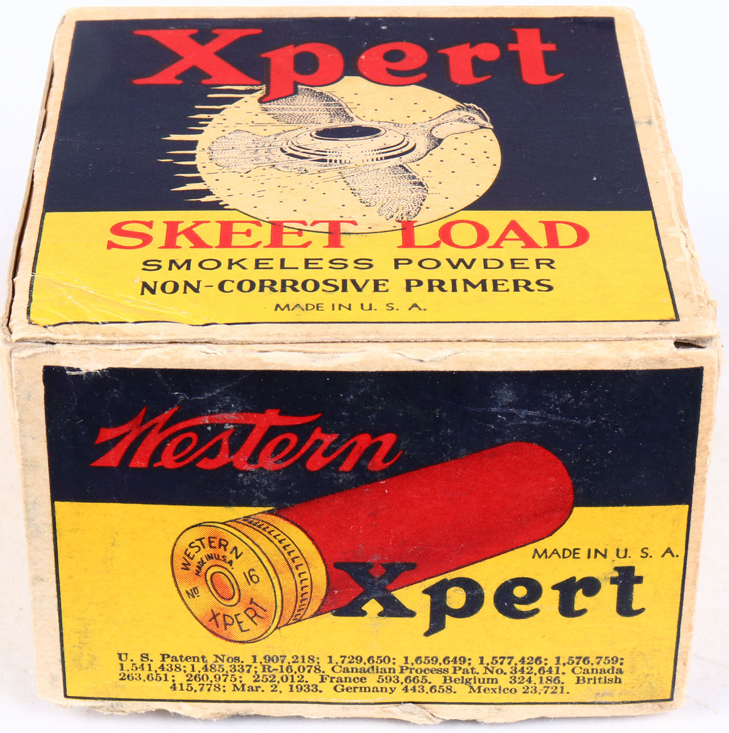 Western Xpert, SKEET LOAD, 16ga., 1pc., Full, white, blue & red box that pictures flying Quail with skeet in body & shot all around, Loading: 2 1/2 Drams 1 Oz. No. 9 Chilled Shot, box has bottom flap disconnected, shell protrusions & with great colors, shells are excellent. Grade: Excellent - Value: 100 to 400