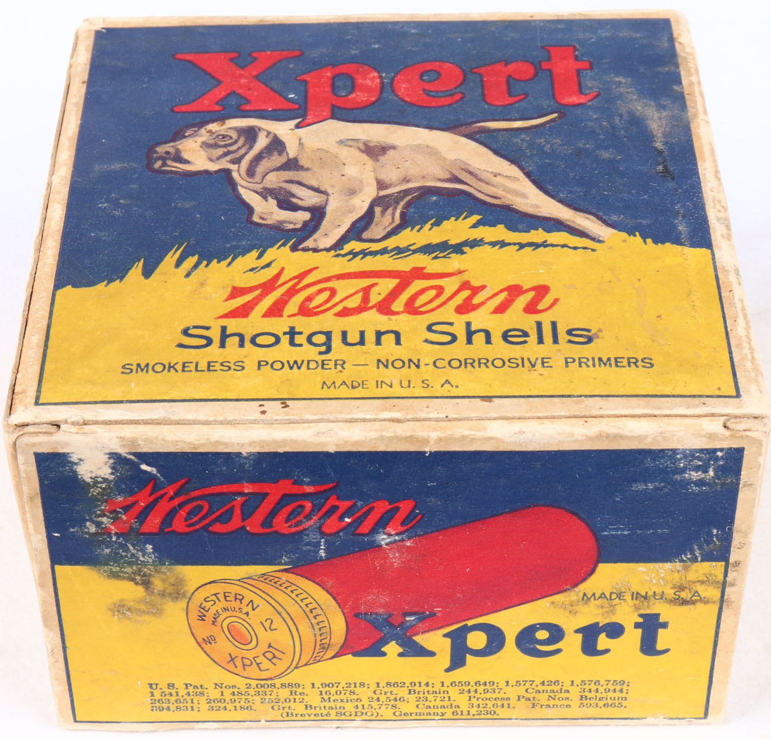 Western Cart. Co., Xpert, 12ga., 1pc., Full with 16 being correct brand, blue, yellow & red box with a dog on point, No. 5 Shot, box has light edge wear, light age soiling, & very nice colors, ammo is excellent. Grade: Very Good ++ - Value: 20 to 60