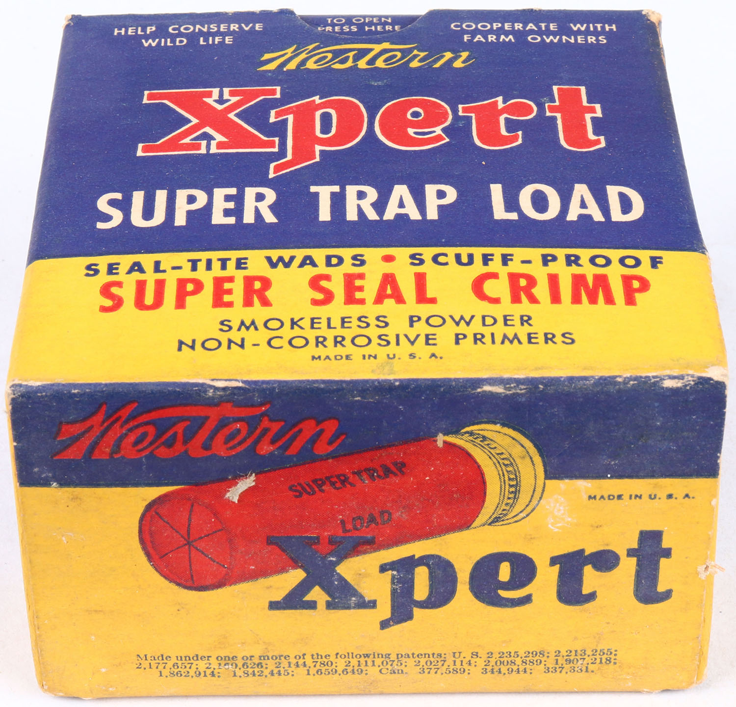 Western, Xpert Super Trap Load, 12ga., 2 3/4'', Hercules Red Dot, 1pc., Full of all incorrect shells, shot size 7 1/2, yellow, blue & red box, box is very solid with light soiling, and very nice colors, shells are excellent. Grade: Excellent + - Value: 10 to 30