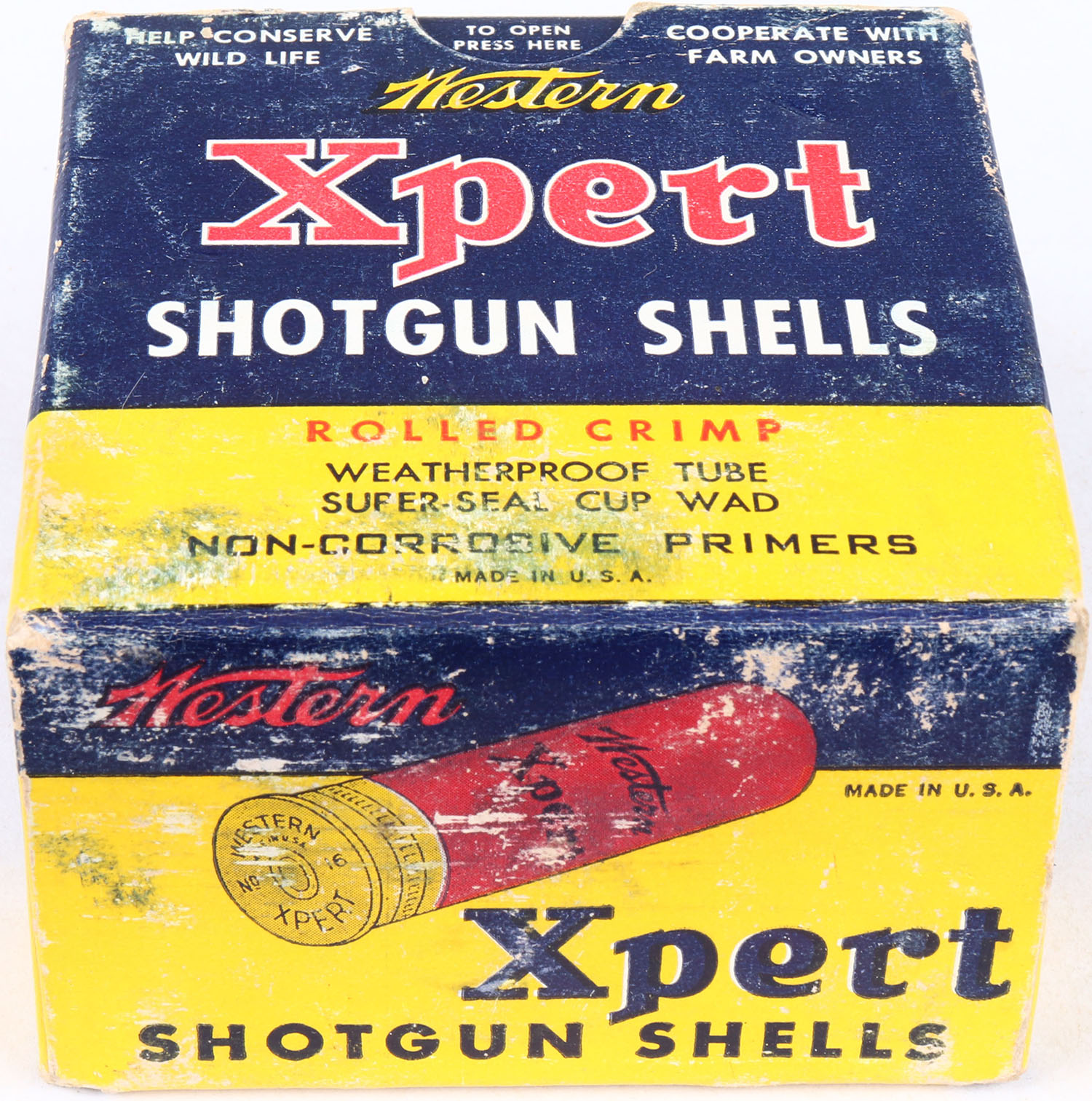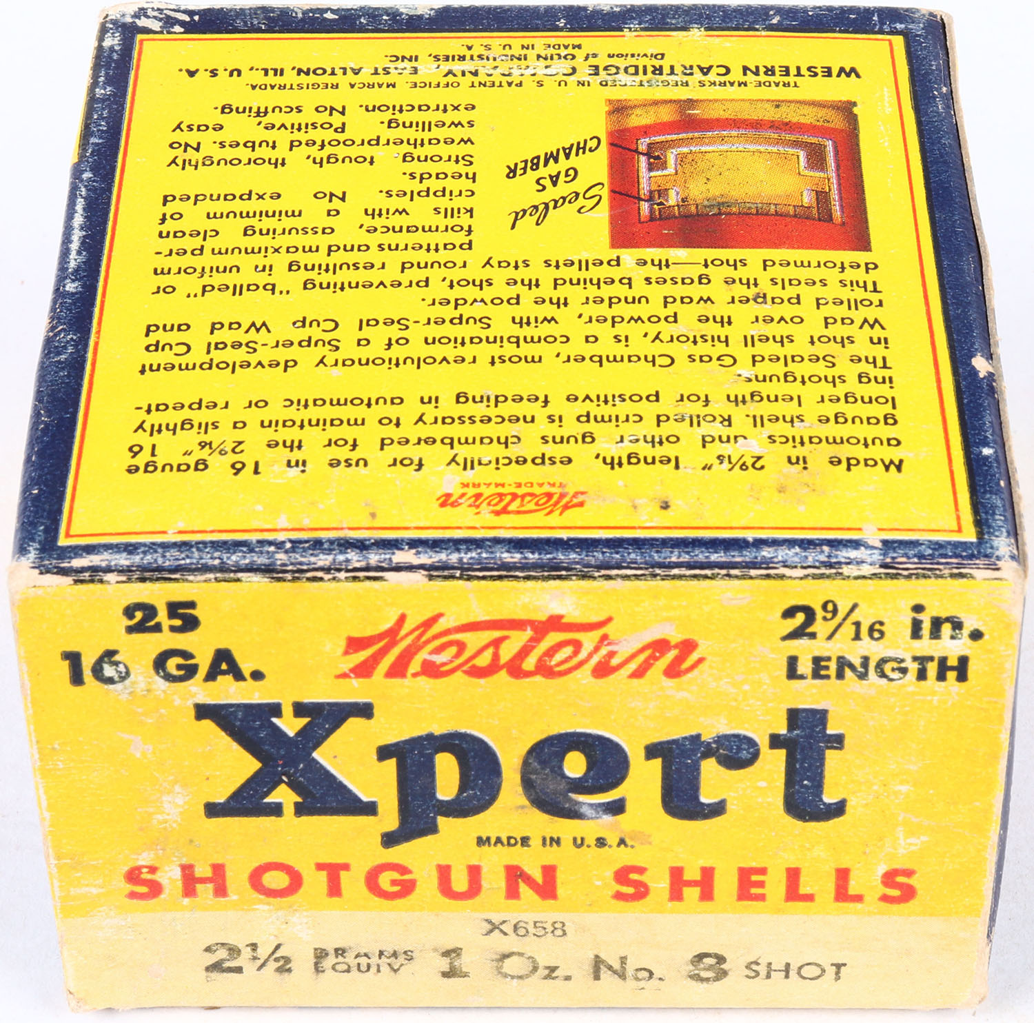 Western, Xpert, 16ga., 2 9/16'', 1pc., Full, shot size 8 Shot, yellow, blue & red box, box is solid with very nice colors and has soiling, shells are excellent. Grade: Excellent - Value: 10 to 30