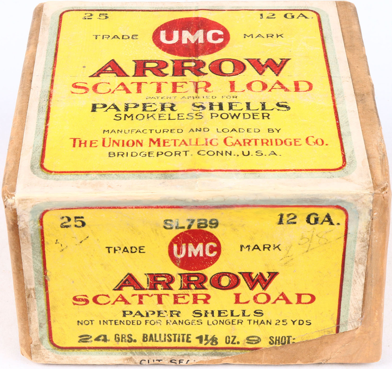 rare UMC, Arrow, 12ga, Scatter Load, 2pc., Empty, No. 9 Shot, buff box with red, yellow, & white paper label, box has been professionally touched up, has seam split & great colors to label. Grade: Excellent - Value: 70 to 350