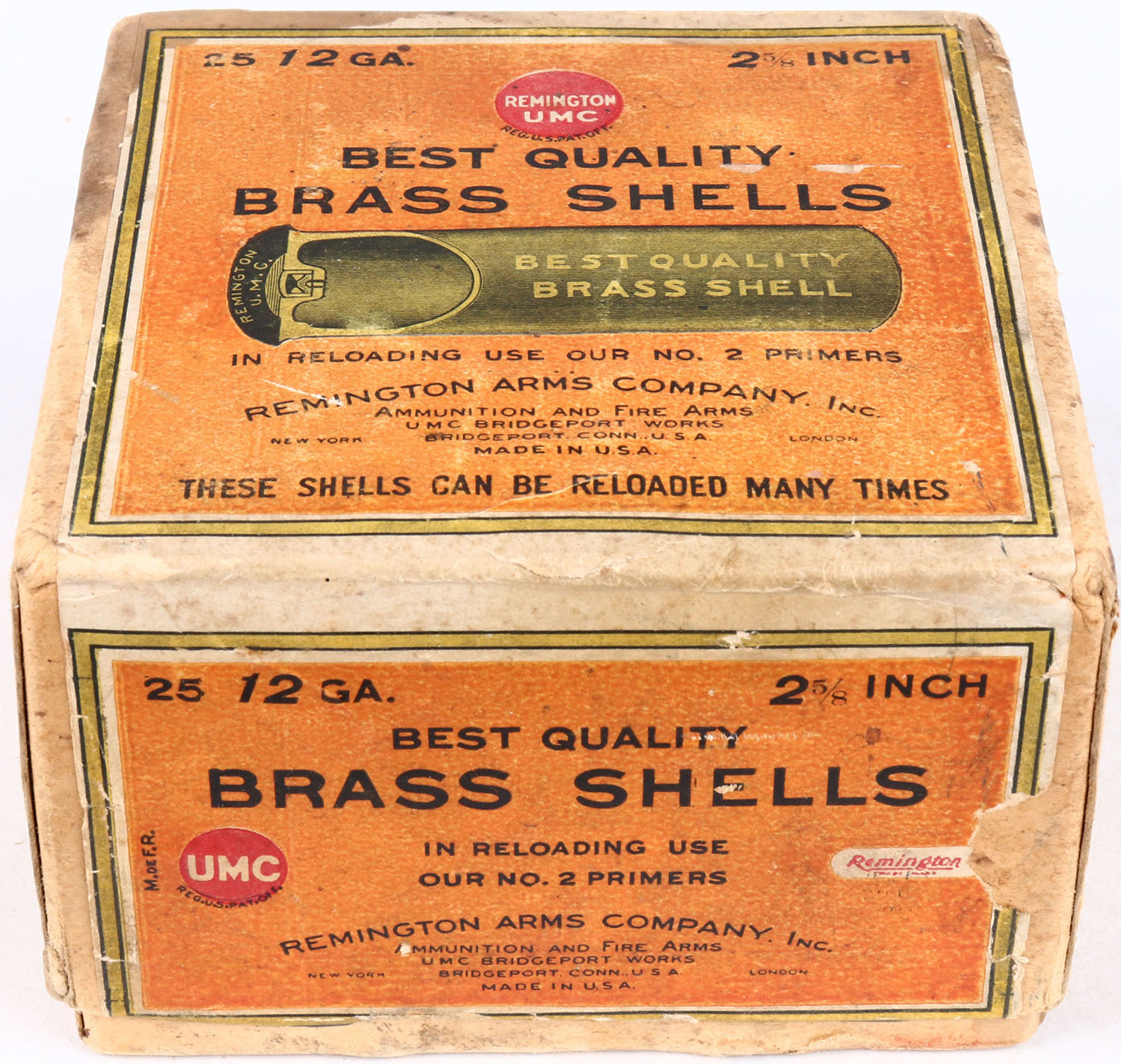 Remington UMC, Best Quality Brass Shells, 12ga., 2pc., Empty, 2 5/8'', buff box with buff, yellow, orange & black label, box is very solid with soiling, shells are very good. Grade: Excellent - Value: 50 to 200