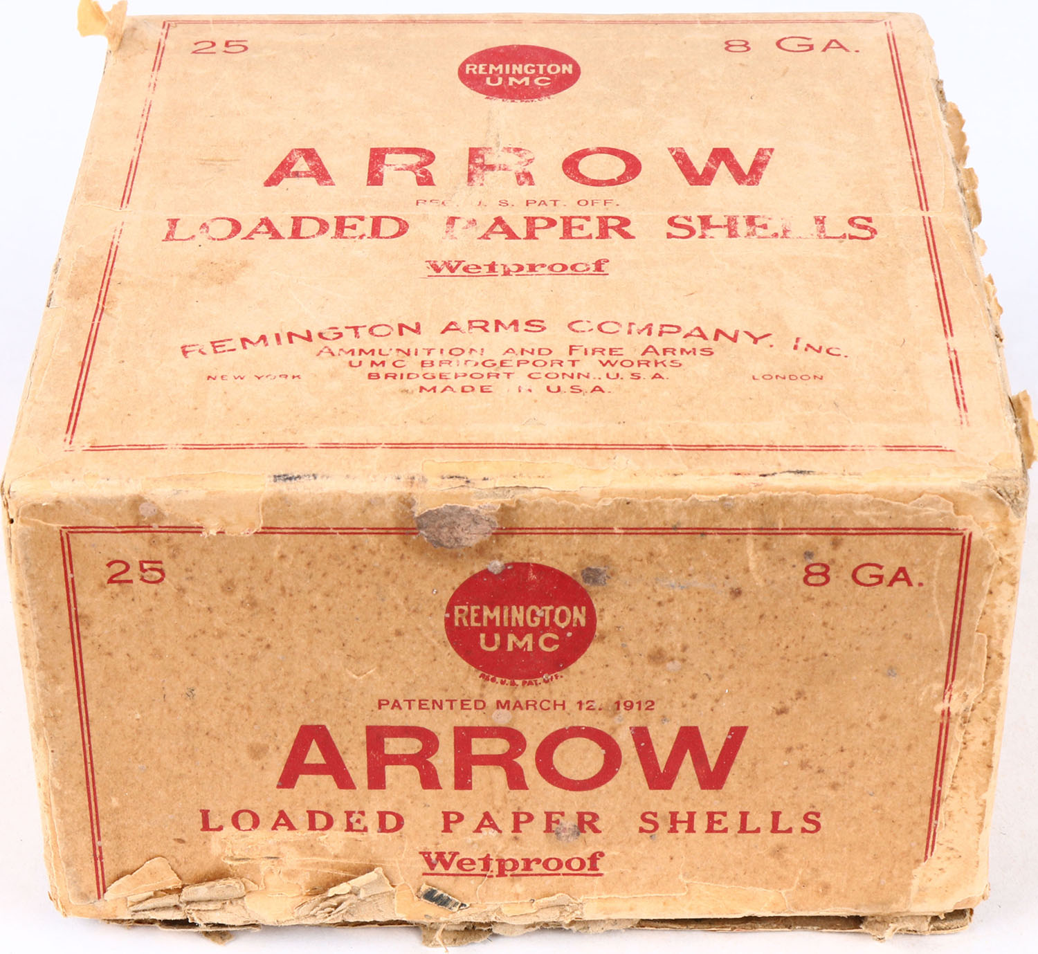 Remington UMC, Arrow, 8ga., 2pc., Full, 3'', buff box with buff, red label, bottom of box is completely disconnected, box has light soiling, seam split, with very good colors. Shells are very good. Grade: Excellent - Value: 50 to 500