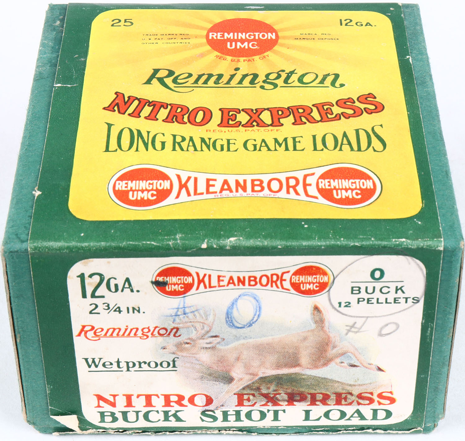 Remington Nitro Express, Long Range Game Loads, pictures Buck jumping, 12ga., 2pc., Partial 18rds., shot size 0 BUCK, green box with sunburst logo & BUCK on side, box is very solid with light soiling, shells are excellent. Grade: Excellent - Value: 50 to 250