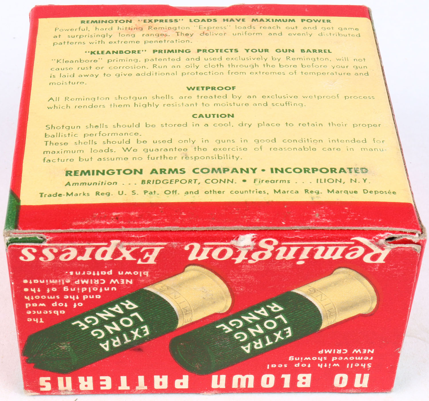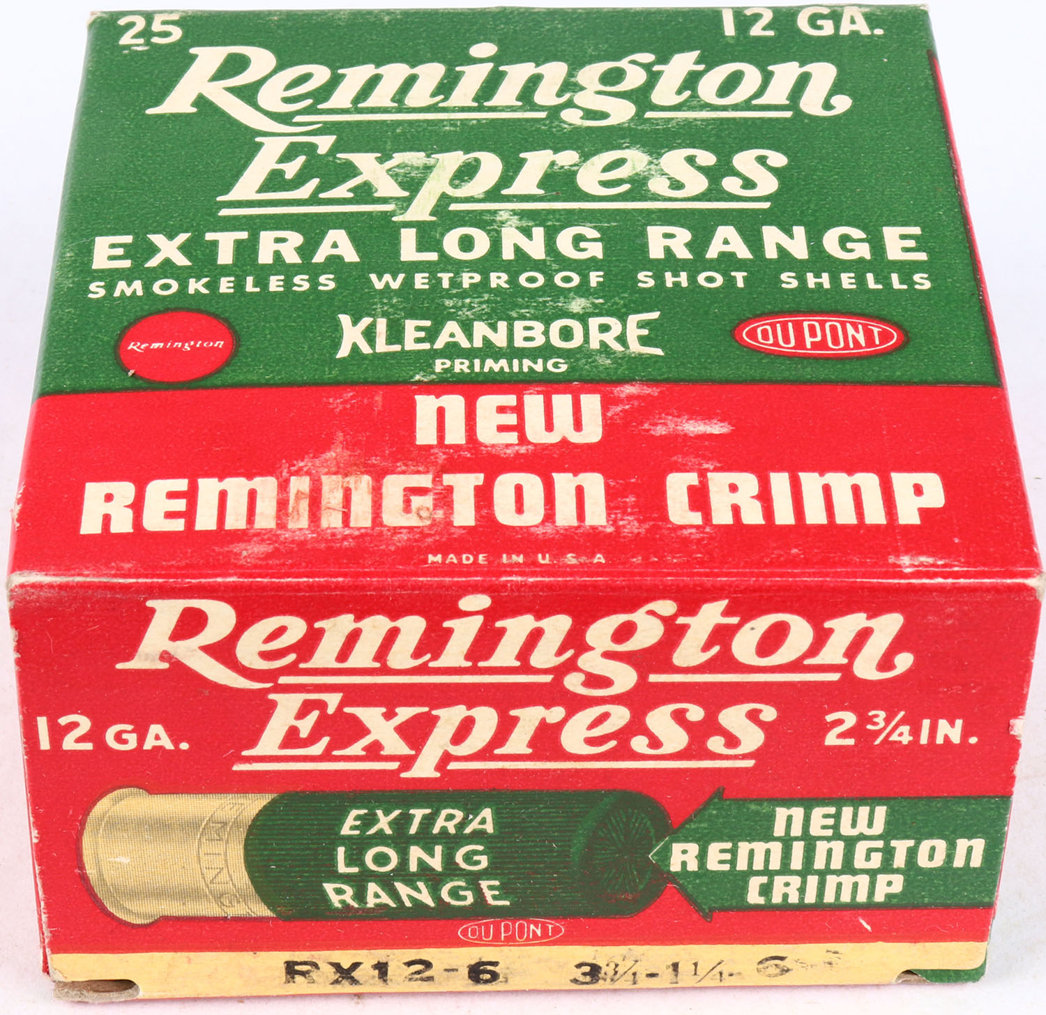 Remington, Express Kleanbore, 12ga., 2 3/4'', 1pc., Full, shot size 6, box is red, white and green, box is solid with great colors, shells are excellent. Grade: Excellent ++ - Value: 10 to 30