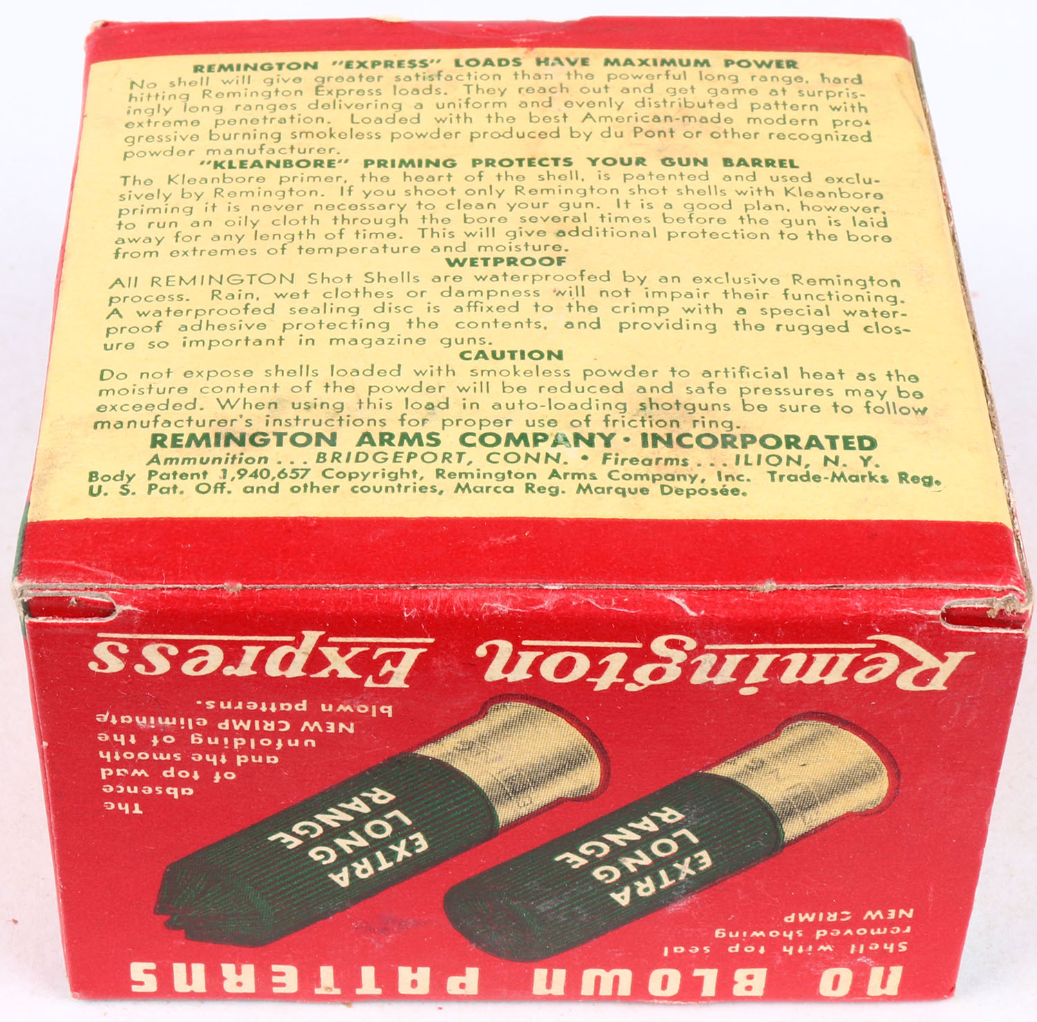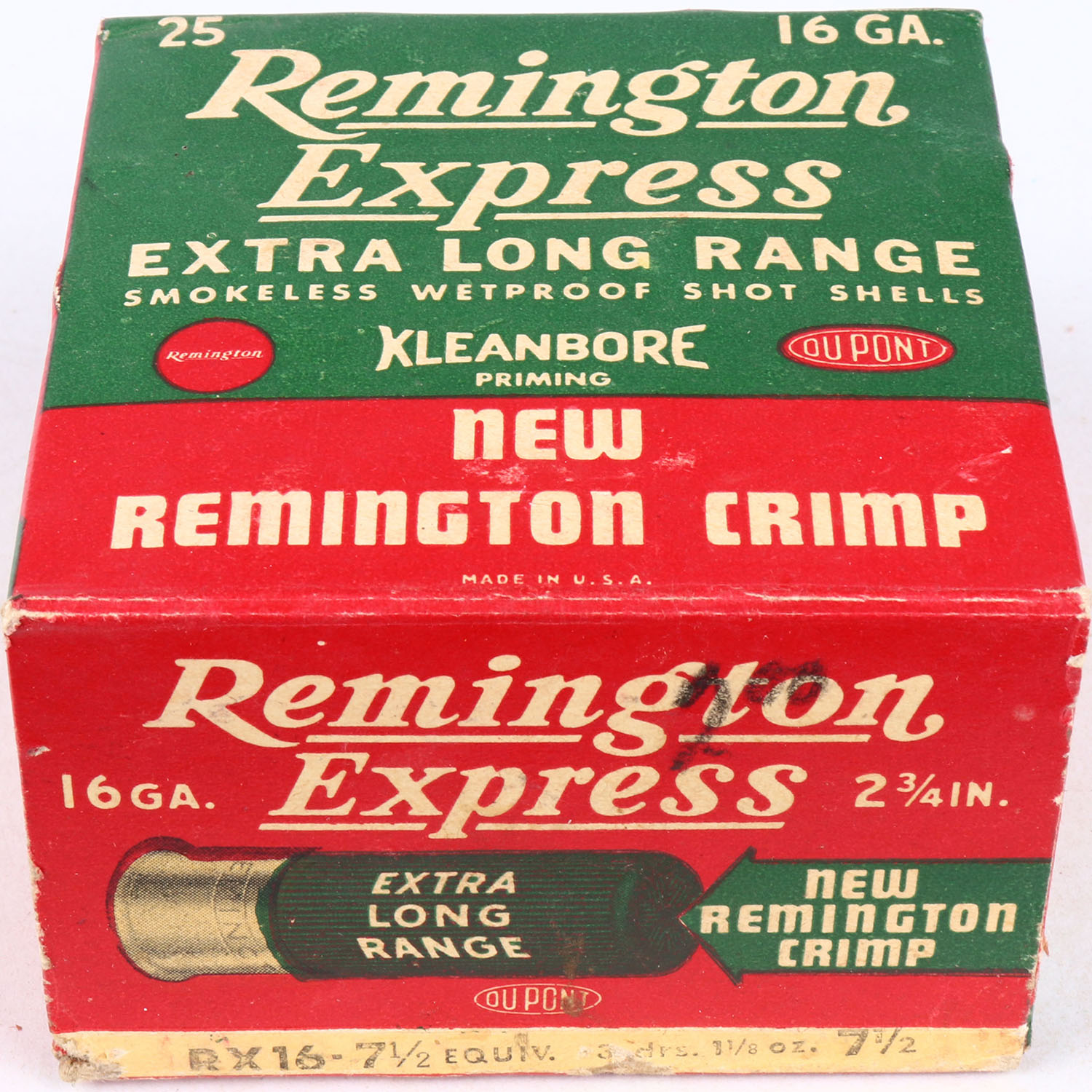 Remington, Express Kleanbore, 16ga., 2 3/4'', 1pc., Full, shot size 7 1/2, box is red, white and green, box is solid with very nice colors, shells are poor. Grade: Very Good ++ - Value: 4 to 20