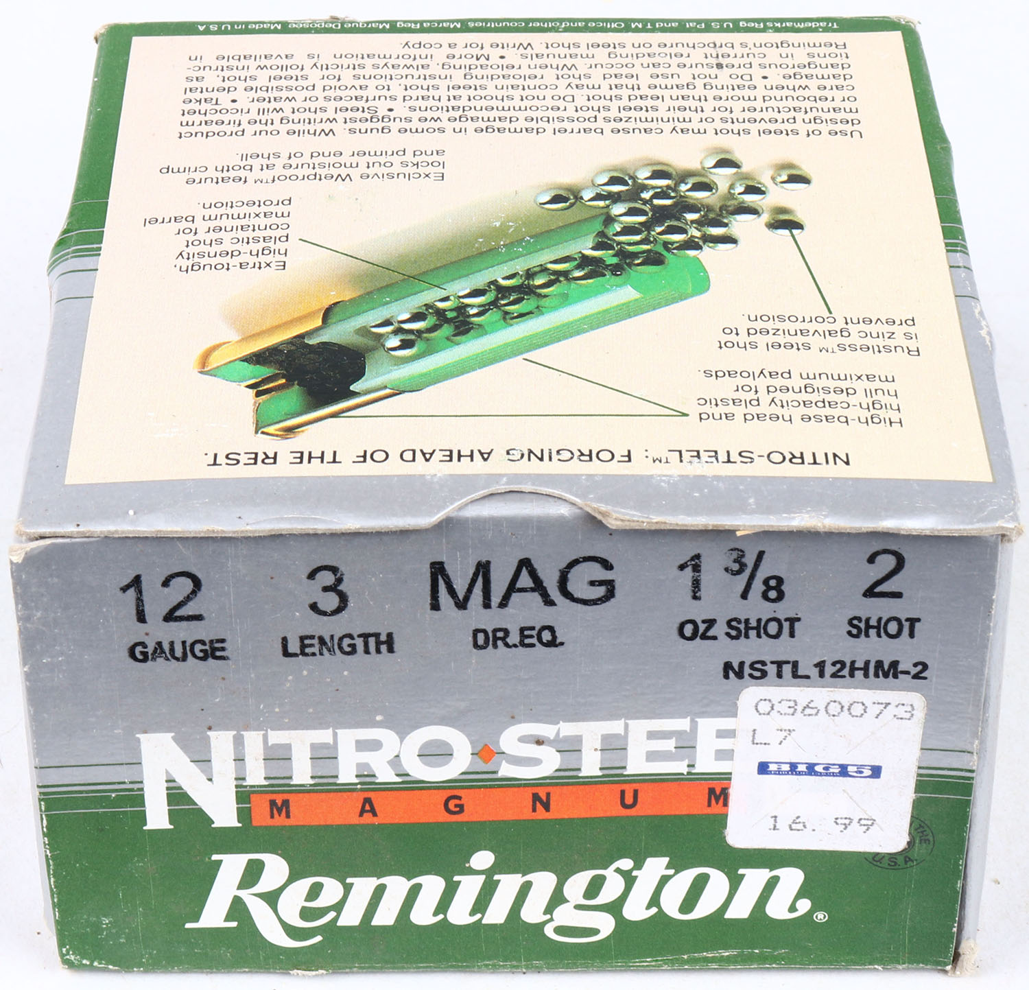 Remington, Nitro Steel Magnum, 12ga., 1pc., Full, shot size 2, multi-colored box, shells are excellent. Grade: Excellent - Value: 10 to 20