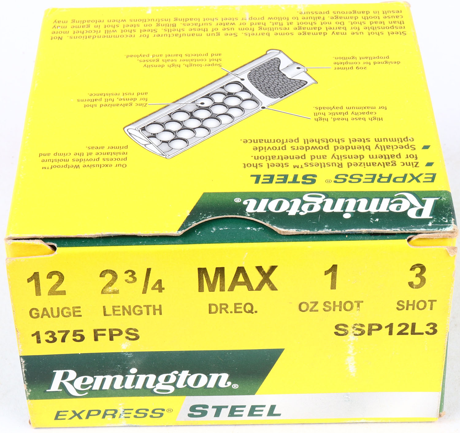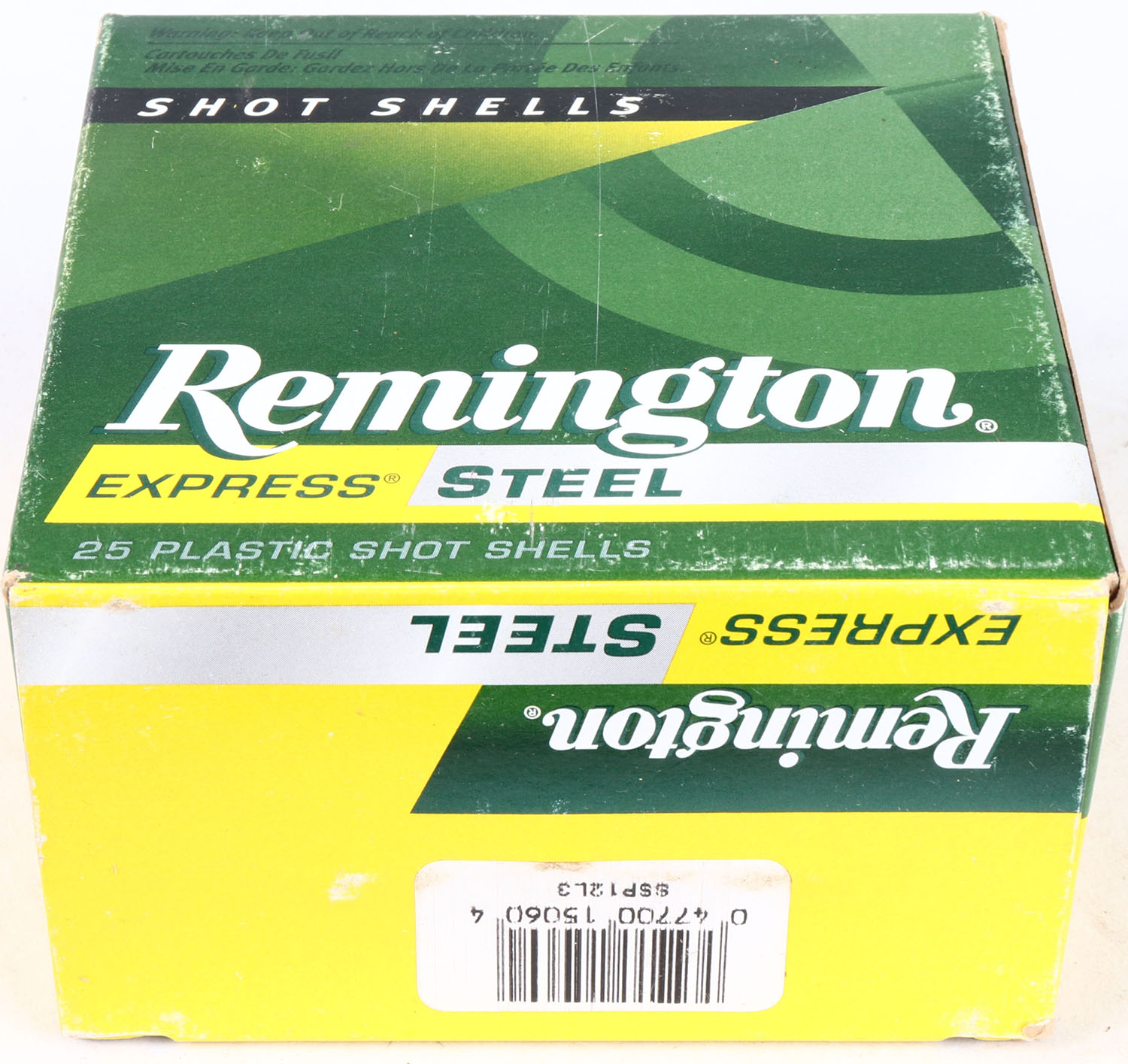 Remington, Express Steel, 12ga., 1pc., Full, shot size 3, multi-colored box, shells are excellent. Grade: Excellent - Value: 10 to 20