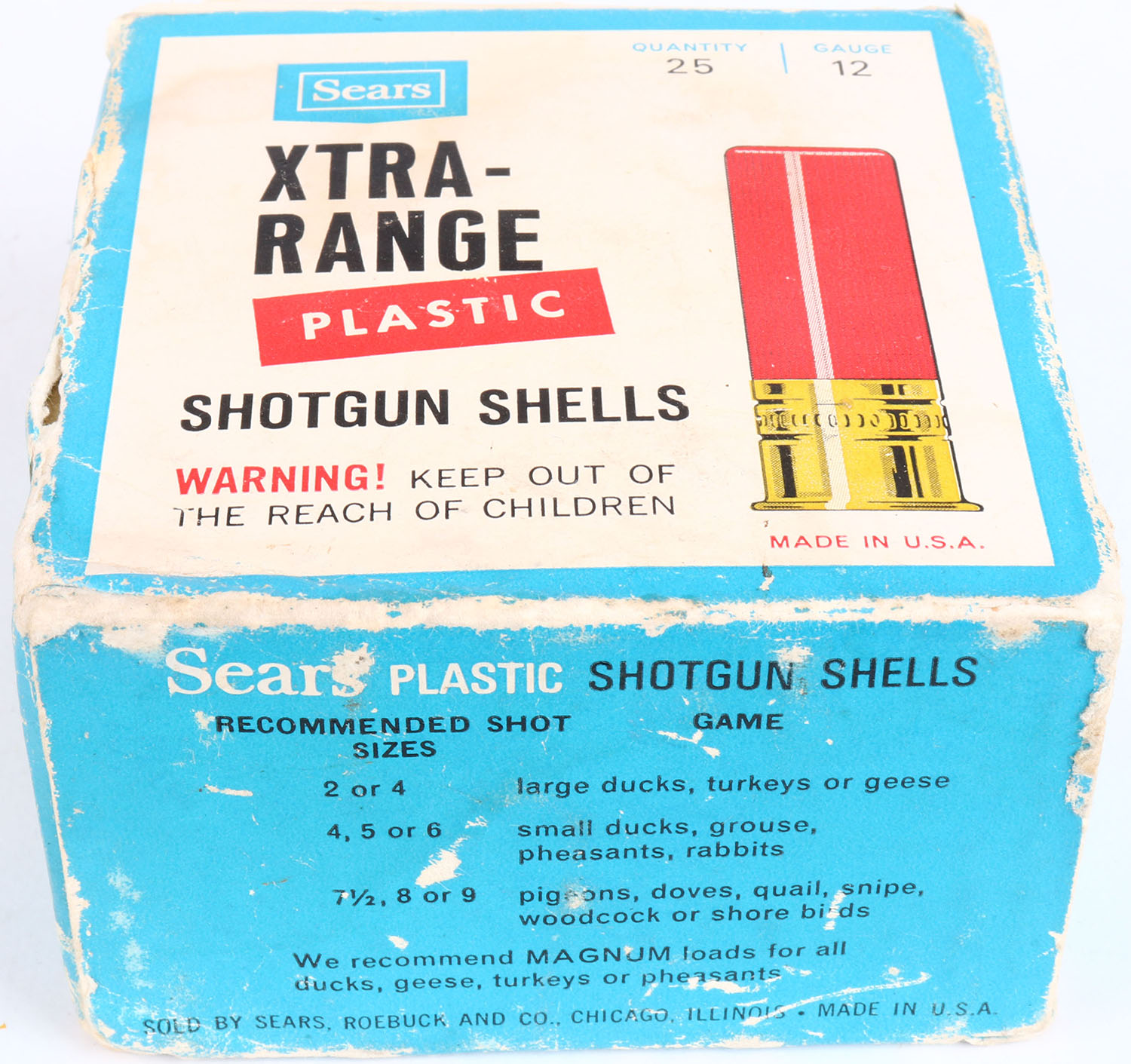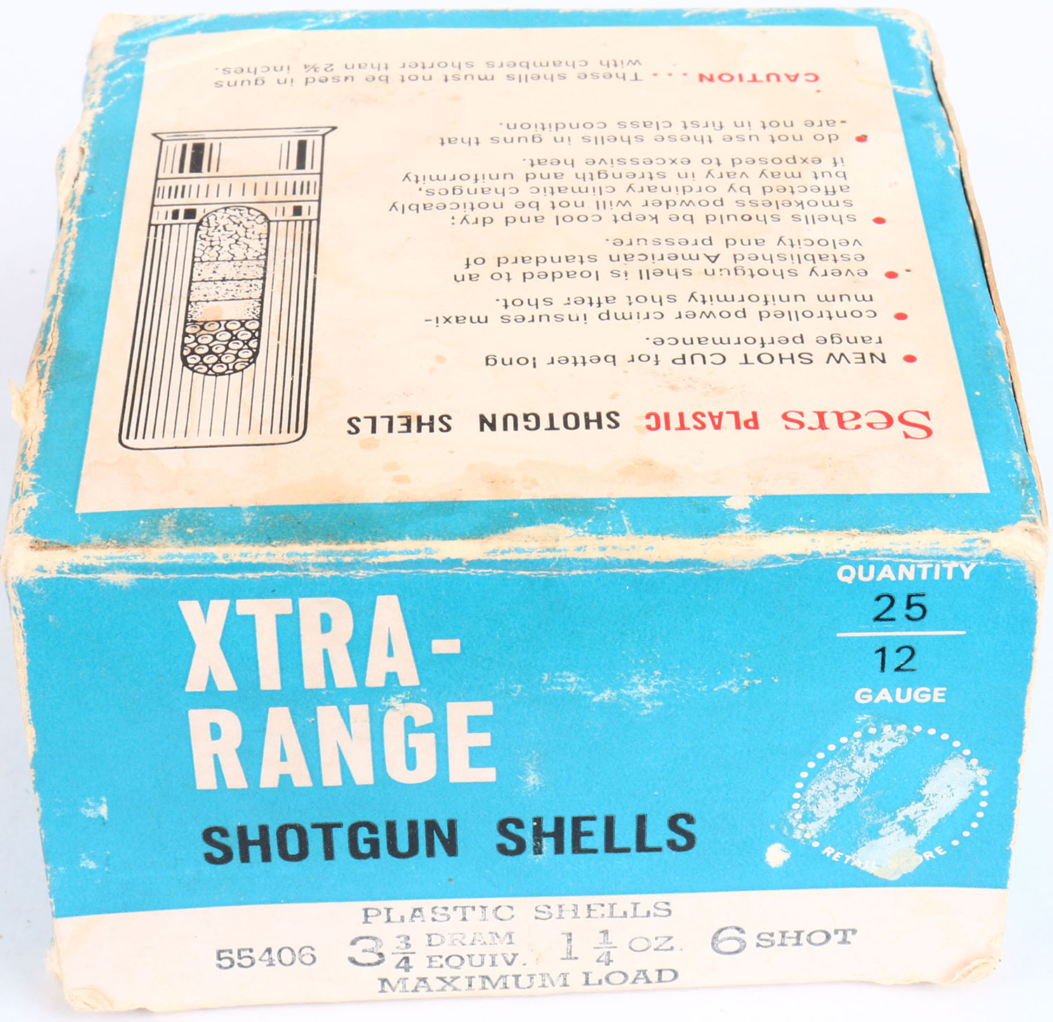 Sears, Xtra-Range, 12ga., 1pc., Partial 23rds, Shot Size 6, box is solid with shell protrusions, scuffing & very nice colors, shells are excellent. Grade: Excellent - Value: 6 to 20
