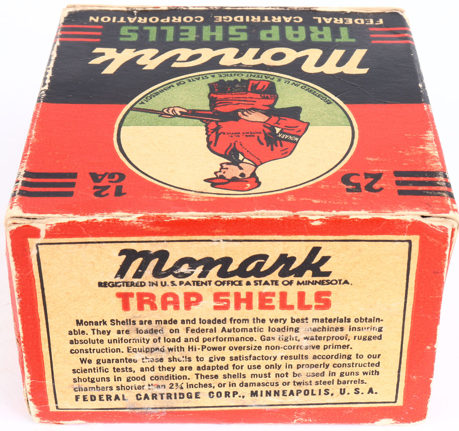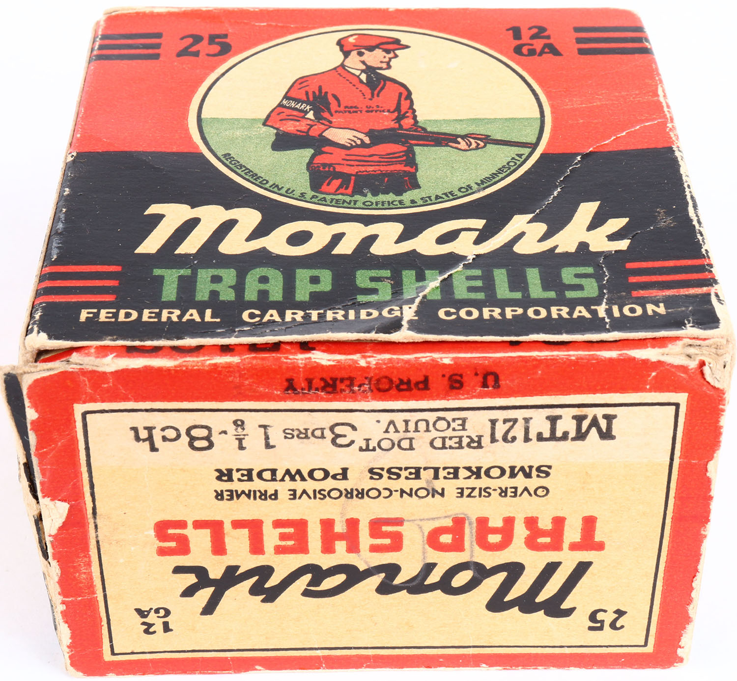 Federal Monark, U.S. Property, Trap Shells, 12ga., 1pc., Empty, shot size 8ch, blue, red & buff box that pictures trap shooter with red sweater & cap, box inside flap is torn & has edge wear, box is solid with very nice color. Grade: Excellent - Value: 20 to 50