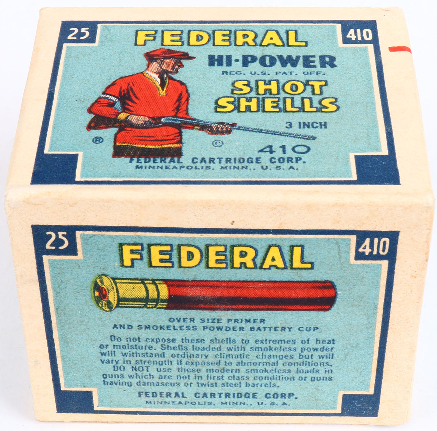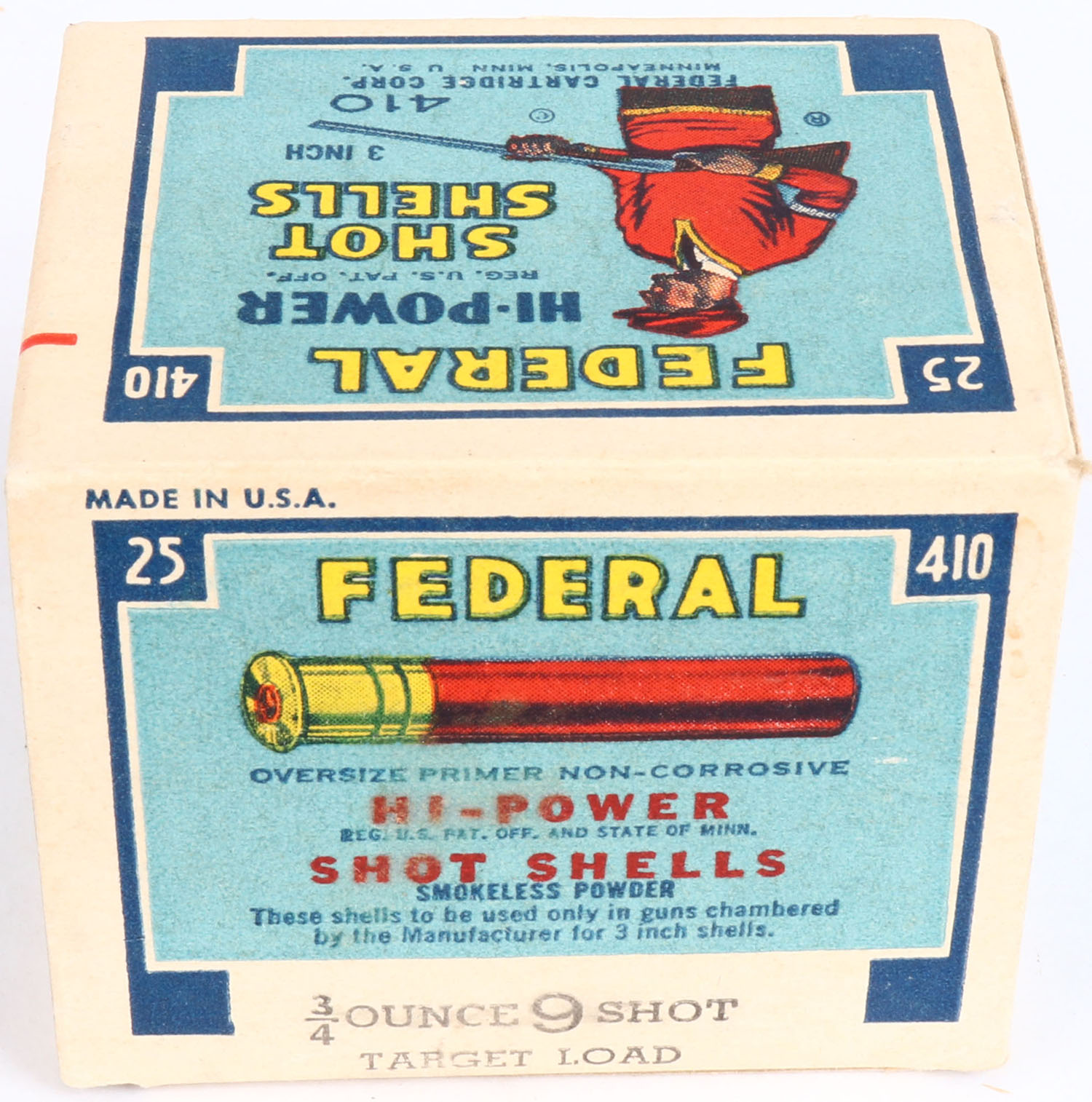 Federal Cart. Co., HI-POWER, 410ga., 1pc., Full, shot size 9, Blue border, blue, yellow and red box with Trap Shooter, box is very solid has great color, shells are excellent. Grade: Excellent ++ - Value: 20 to 50