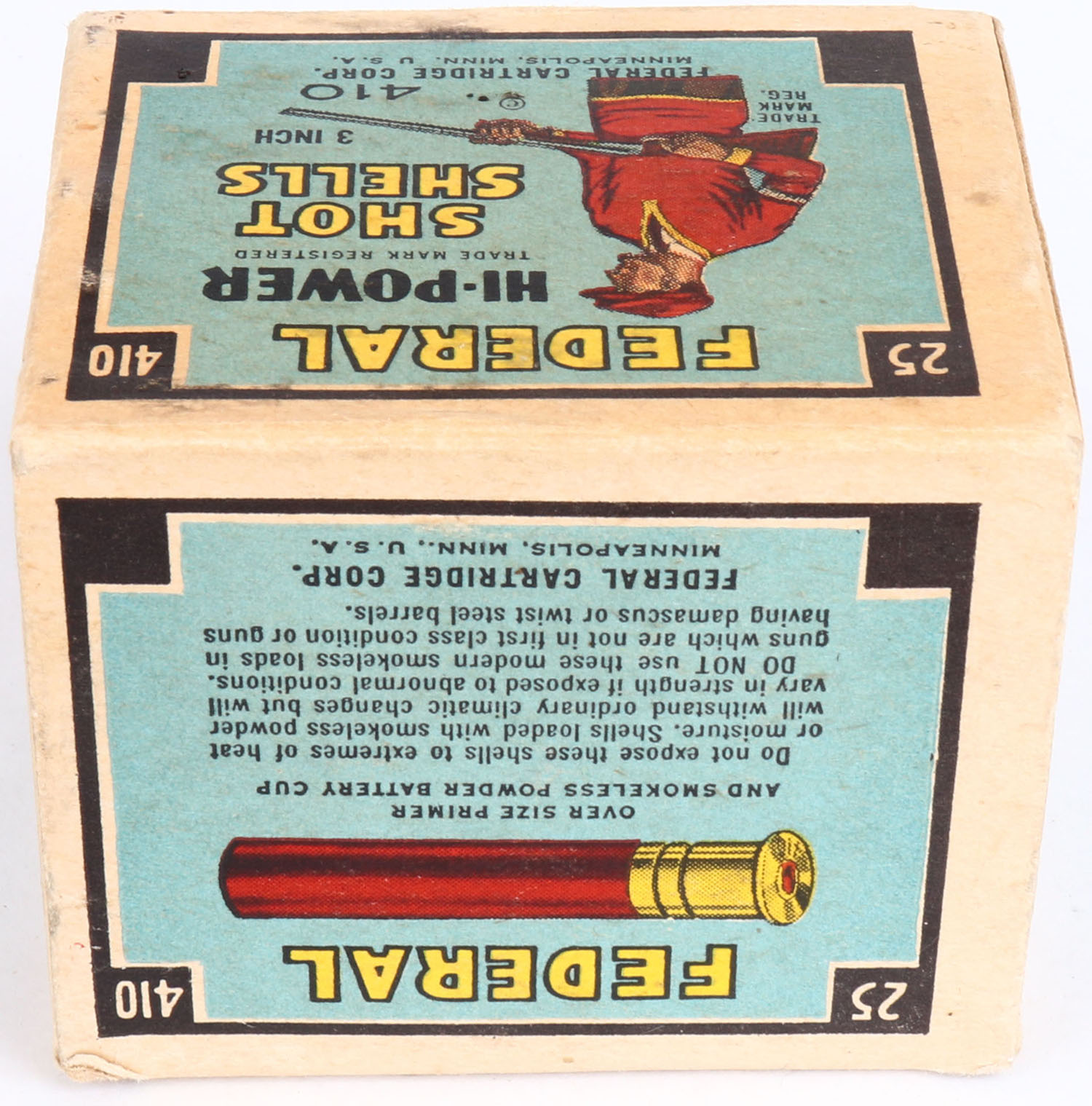 Federal Cart. Co., HI-POWER, 410ga., 1pc., Full, shot size 7 1/2, Black border, blue, yellow and red box with Trap Shooter, box is very solid has great color, shells are excellent. Grade: Excellent + - Value: 20 to 50