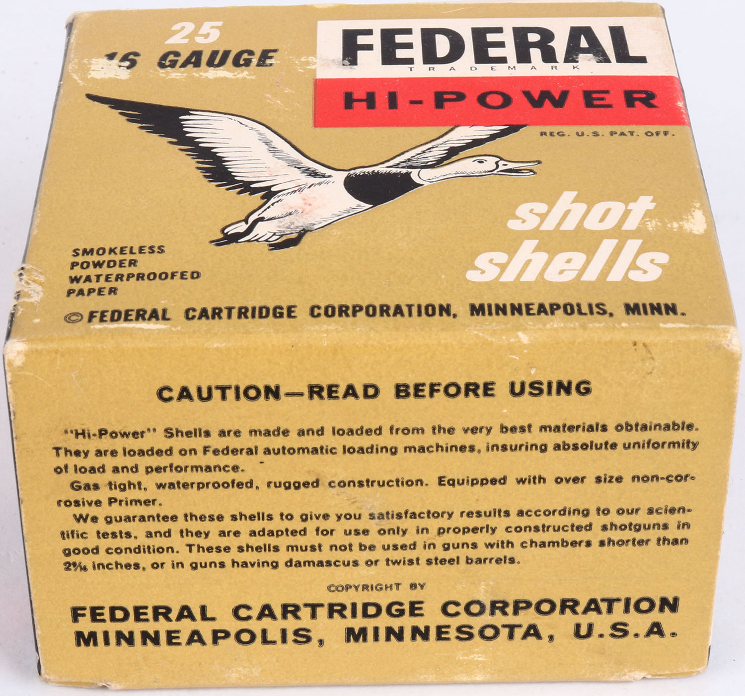 Federal, Hi-Power, 16ga., 1pc., Full, shot size 6, multi-colored box, shells are excellent. Grade: Excellent - Value: 10 to 20