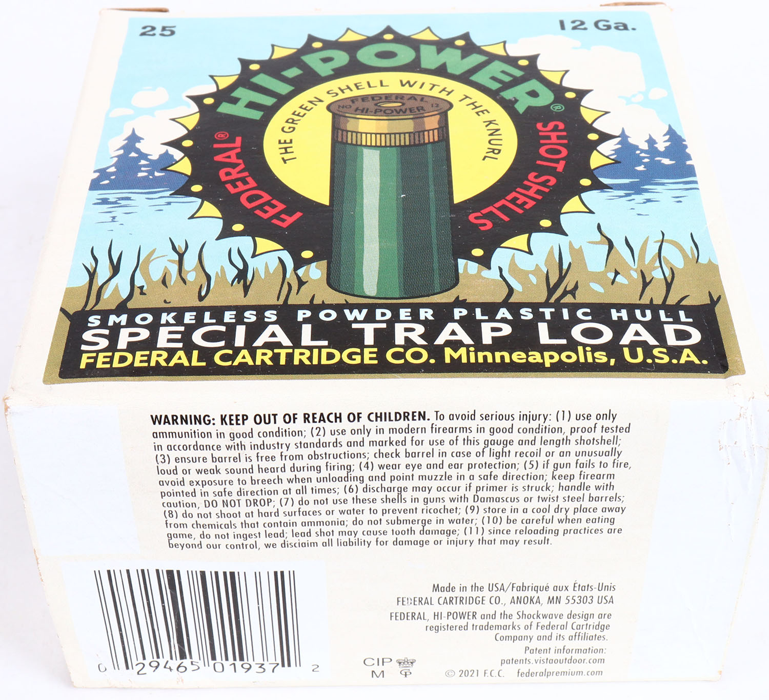 Federal Cart. Co., Hi-Power 100 Year Anniversary, 12ga., 1pc., Full, shot size 8 Special Trap Load, multi-colored box with green shell in front of marsh, box very solid with Minty color box shows earlier boxes and when they were introduced also tells little story about Federal, shells are Minty. Grade: Excellent ++ - Value: 20 to 60
