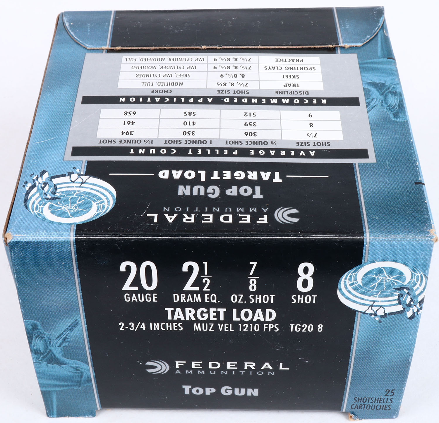 Federal, Target Load, 20ga., 1pc., Full, shot size 8, multi-colored box, shells are excellent. Grade: Excellent - Value: 10 to 20