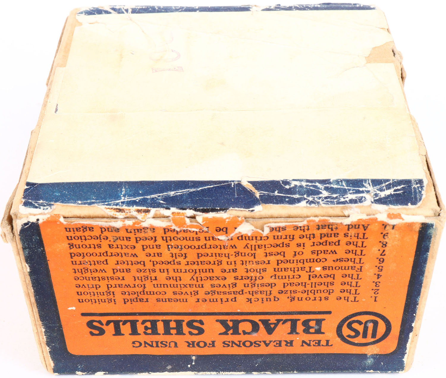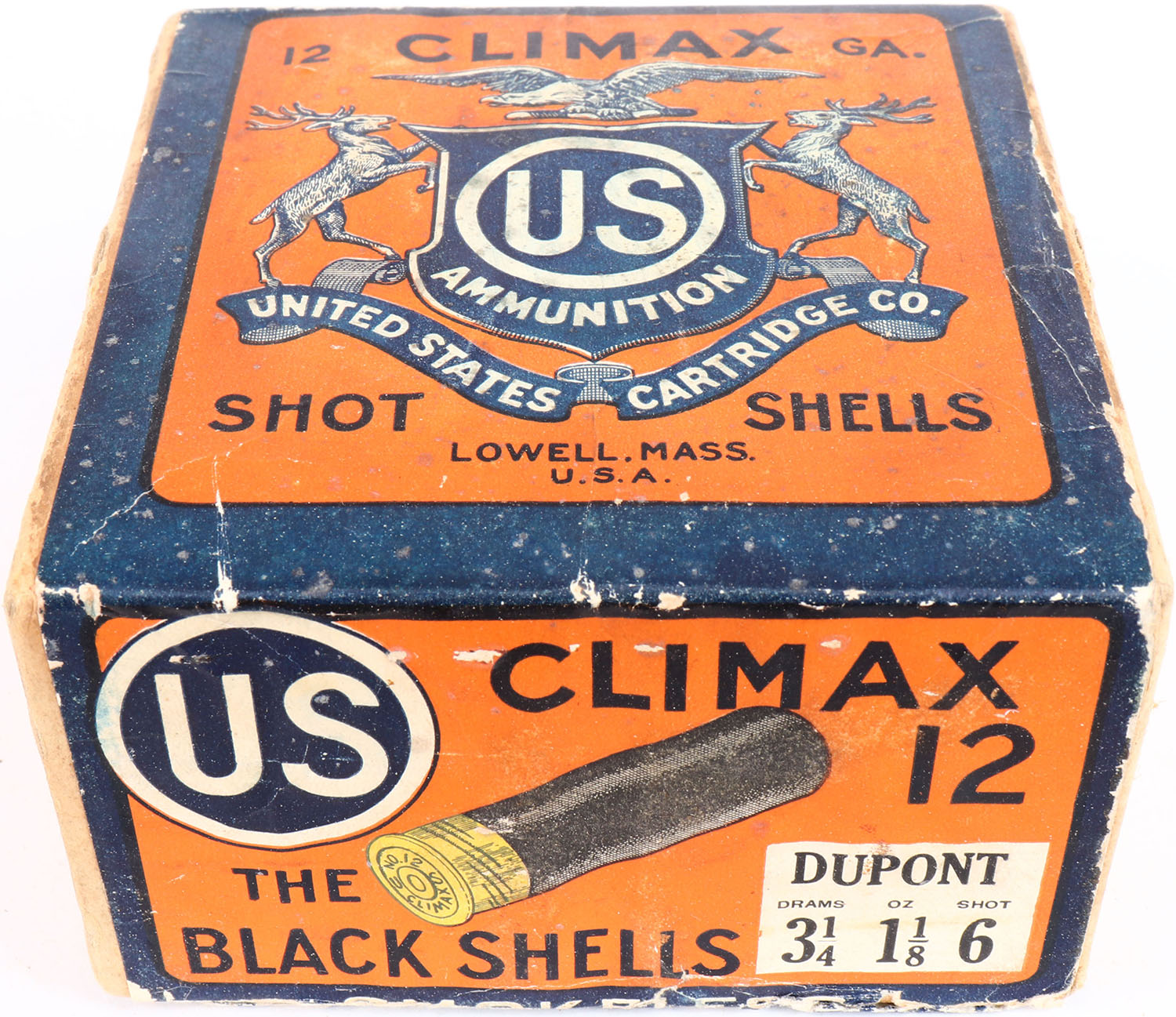 US Cart. Co., Lowell, Mass, Climax, 12ga, 2pc., Empty, shot size 6, buff box orange, blue & white label, box has edge wear & light soiling with very nice colors. Grade: Very Good ++ - Value: 20 to 60