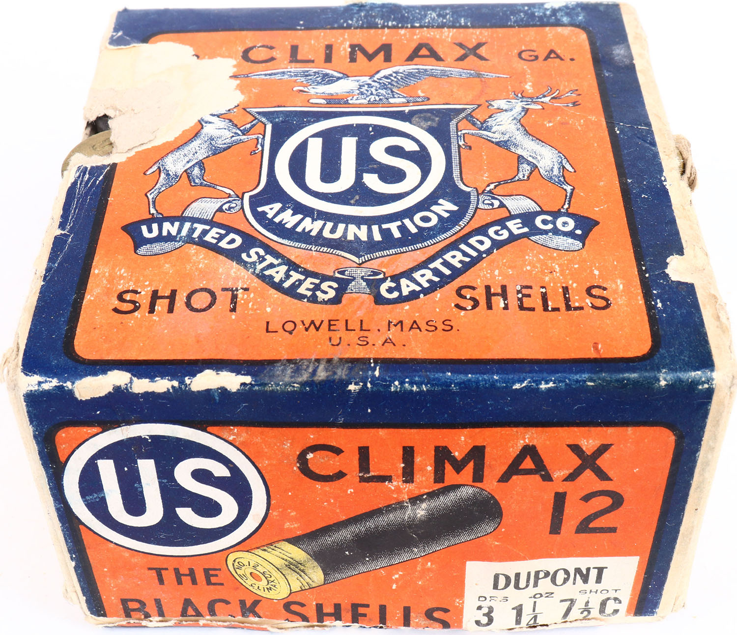 US Cart. Co., Lowell, Mass, Climax, 12ga, 2pc., Full, shot size 7 1/2C, buff box orange, blue & white label, box has edge wear, shell protrusions & scuffing with very nice colors, Shells are excellent. Grade: Very Good ++ - Value: 20 to 80