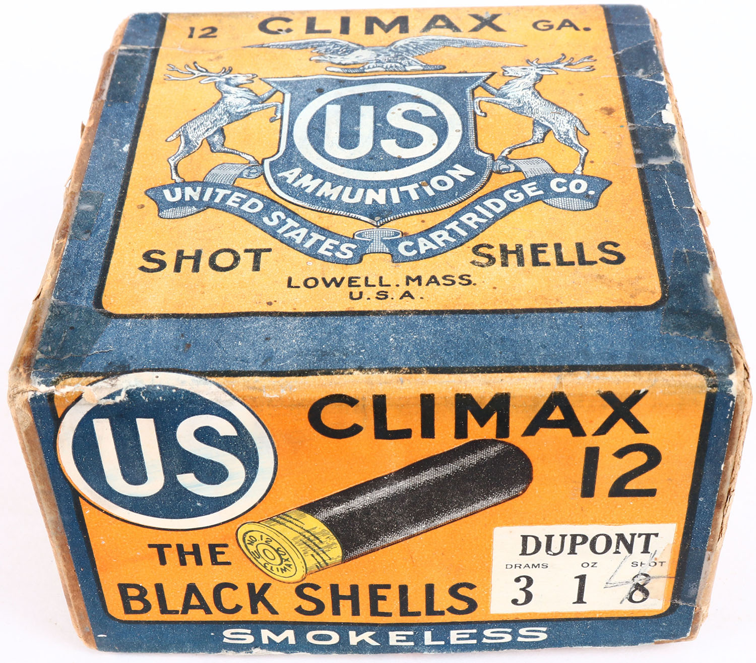 US Cart. Co., Lowell, Mass, Climax, 12ga, 2pc., Empty, shot size 8, buff box orange, blue & white label, box has taped seam splits, age soiling, edge wear, torn left side of box with nice colors. Grade: Very Good + - Value: 10 to 60