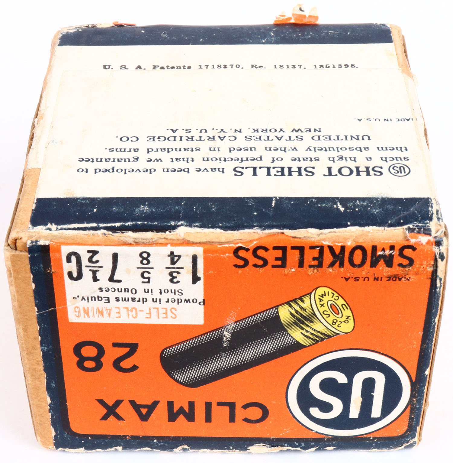 US Cart. Co., Lowell, Mass, Climax, 28ga, 2pc., Full, shot size 7 1/2C, buff box orange, blue & white label, box has scuffing & light edge wear with great colors. Grade: Excellent - Value: 30 to 100