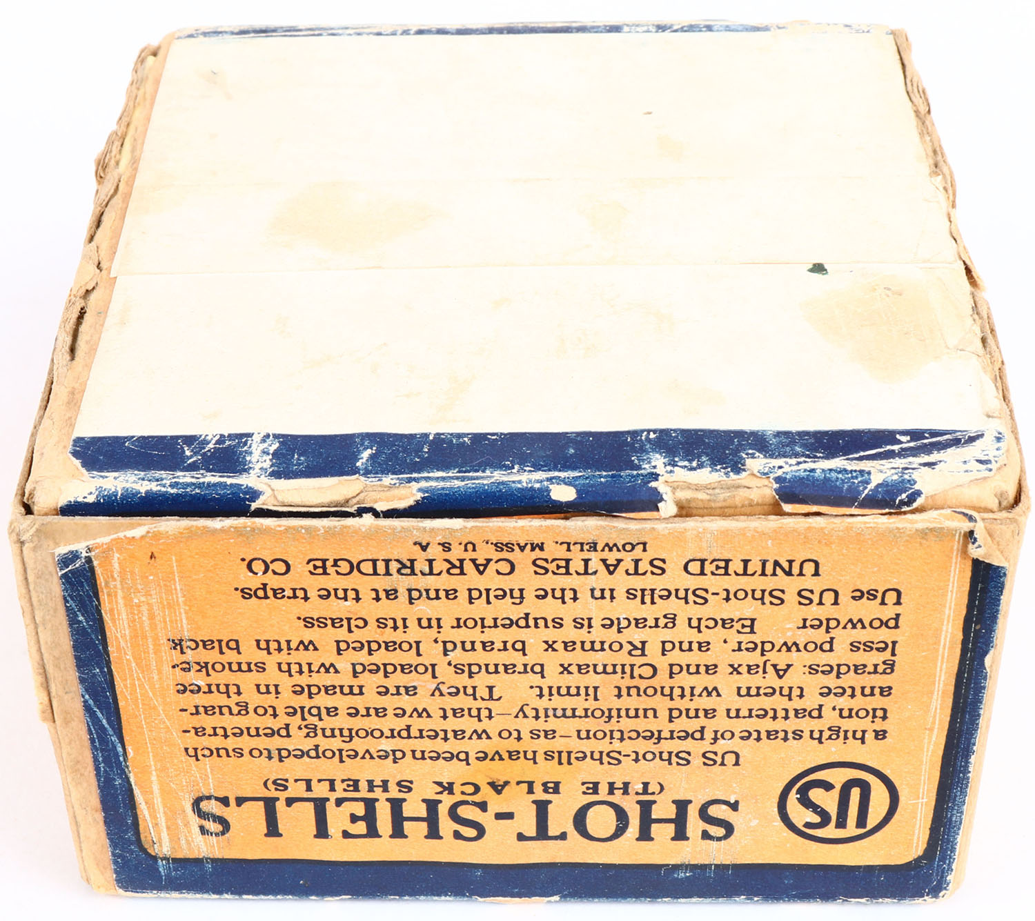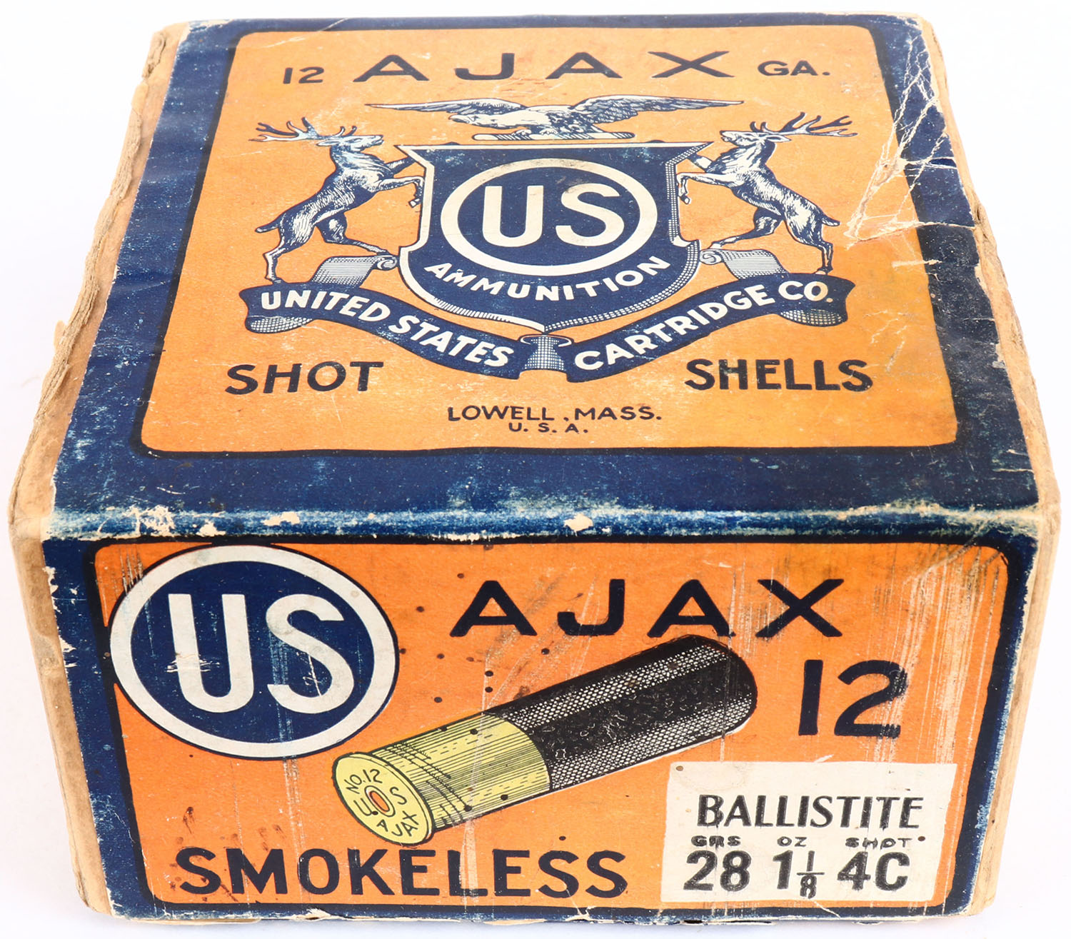 US Cart. Co., Lowell, Mass, Ajax, 12ga, 2pc., Empty, shot size 4C, buff box orange, blue & white label, box has seam split, tape repair, edge wear & light age soiling with great colors. Grade: Very Good ++ - Value: 20 to 60