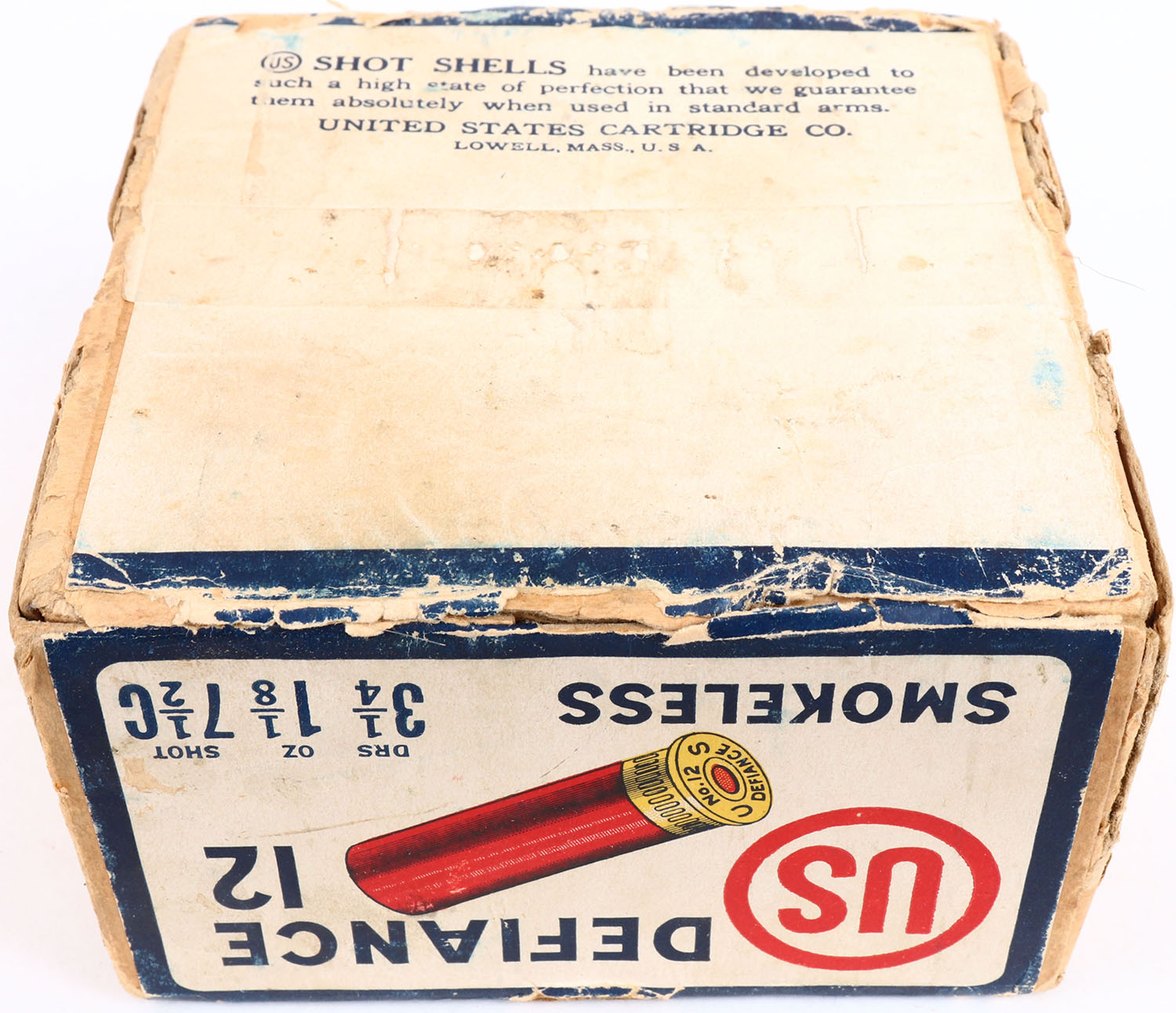 United States Cart. Co., Lowell, Mass, DEFIANCE, 12ga., 2pc., Empty, shot size 7 1/2C, buff box with white, red & blue label, box has seam split, light edge wear & scuffing with very nice label. Grade: Excellent - Value: 40 to 100