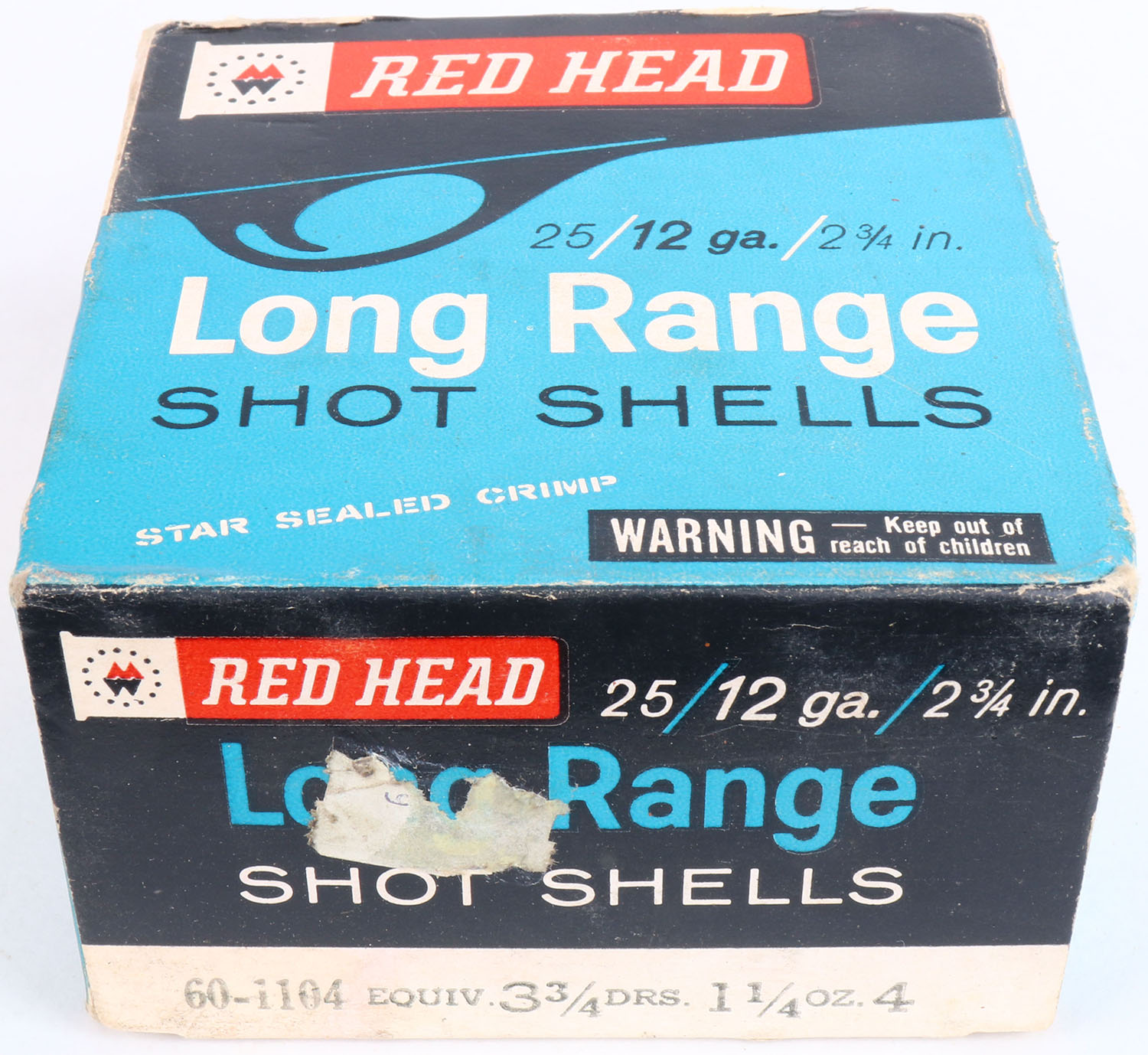 Montgomery Ward Red Head, 12ga., 1pc., Full, shot size 4, box is solid with very nice colors, shells are excellent. Grade: Excellent + - Value: 10 to 30
